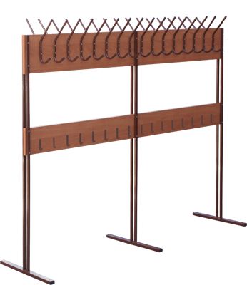 Вешало изготавливается на металлокаркасе из тонкостенного электросварного профиля, соединенном панелями из ЛДСП класса эмиссии Е1 толщиной 22 мм. На панелях крепятся 32 металлических крючка для одежды и 32 металлических крючка для сумок и пакетов. Металлокаркас представляет собой три отдельных опоры, основание которых изготавливается из профиля 40х25х1,5 мм и двух стоек из профиля 20х20х1,5 мм.