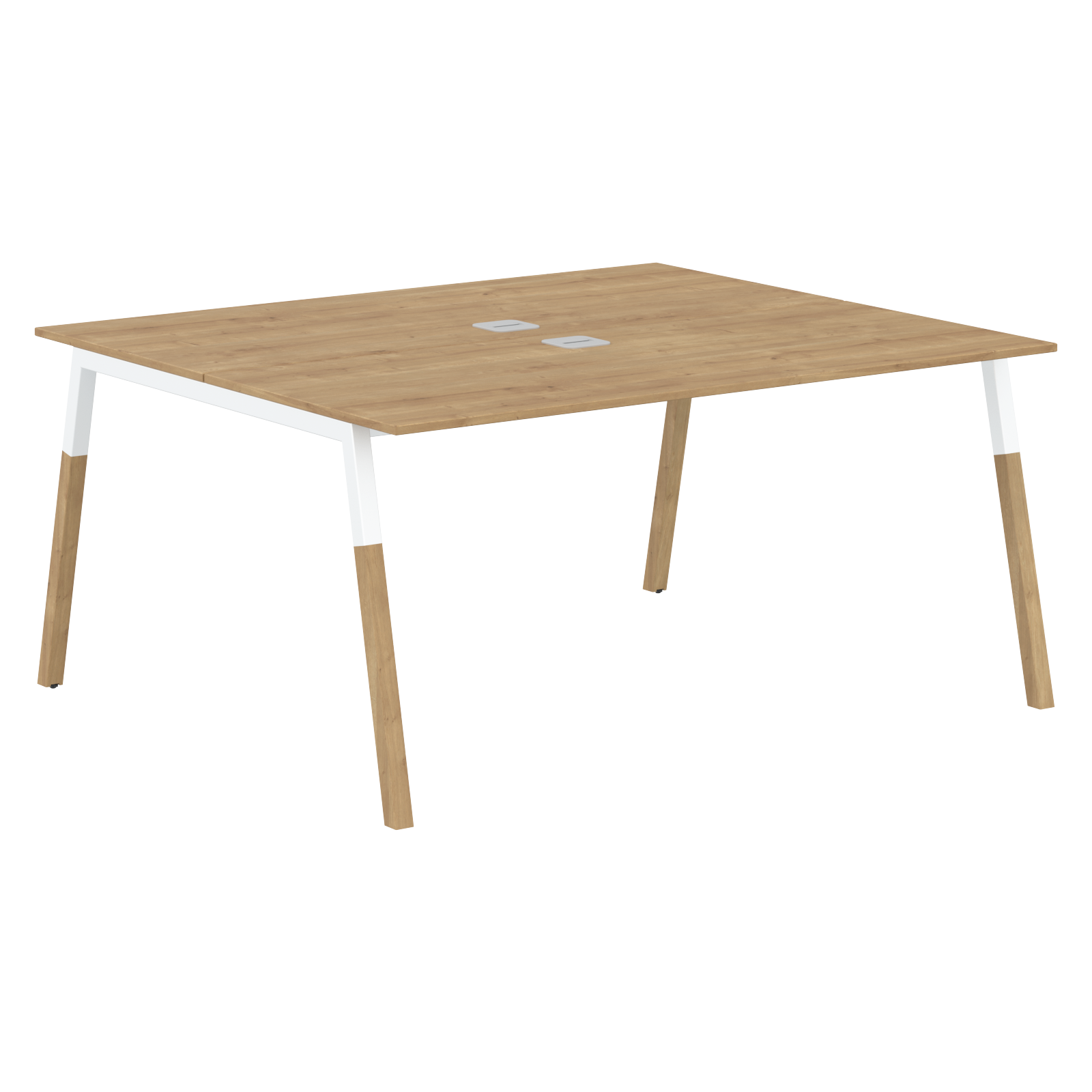 Столешницы из ЛДСП т.18мм. c кромкой ABS т.2.мм, каждая комплектуется квадратной заглушкой кабель-канала по центру и каждая 2-мя траверсами. Между столешницами имеется зазор 6 мм для установки настольных экранов. Опоры комбинированные А-образной формы, верхняя часть из профиля трубы 40х40мм и нижняя часть из массива бука; отделка – масло-воск. Опоры имеют регулировку внизу.
