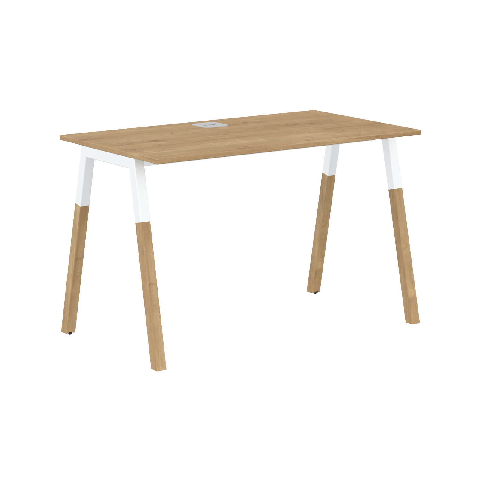 Столешница прямолинейная из ЛДСП т.18мм. c кромкой ABS т.2.мм, комплектуется квадратной заглушкой кабель-канала по центру, 2-мя траверсами и комбинированными опорами А-образной формы, верхняя часть из профиля трубы 40х40мм и нижняя часть из массива бука; отделка – масло-воск. Опоры имеют регулировку внизу