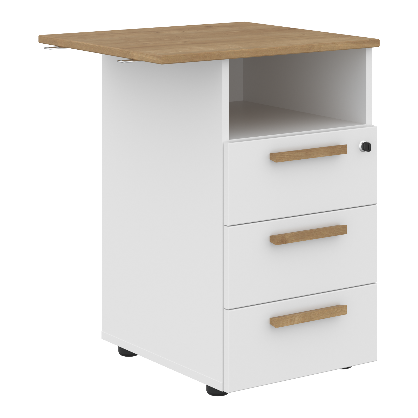 Тумба приставная с открытой нишей, полностью - из ЛДСП т.18мм, с кромками ABS т.2мм и 0,45мм, комплектуется центральным замком, регулируемыми опорами шкафной группы 50х27 черного цвета. Ящики-фолдинг, дно белого цвета. Ручка накладная, расположение горизонтальное, материал - массив бука, отделка – масло-воск. Каркас в цвете Белый премиум и Черный графит, топ в цвете Белый премиум, Черный графит и Дуб Гамильтон.