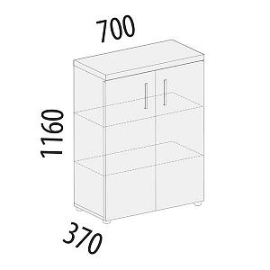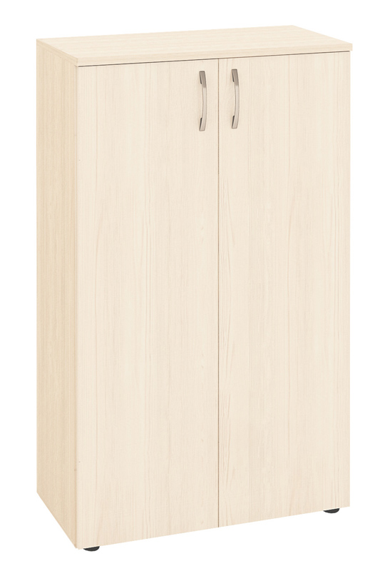 Шкаф является частью модульного набора мебели для офиса «Рубин». Модуль разделён полками на три секции и укомплектован дверями ЛДСП. Регулируемые по высоте ножки позволяют при установке компенсировать возможные неровности пола.