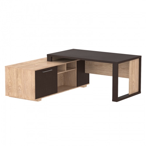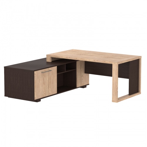 из ЛДСП т.38мм, кромка ПВХ. Фронтальная панель короткая. Стол имеет несущую тумбу с открытыми нишами и слайд-дверью. Изготавливается в комбинированном цвете.