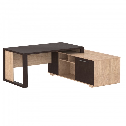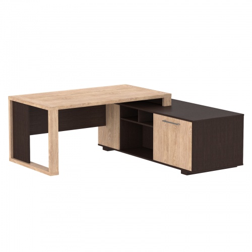 из ЛДСП т.38мм, кромка ПВХ. Фронтальная панель короткая. Стол имеет несущую тумбу с открытыми нишами и слайд-дверью. Изготавливается в комбинированном цвете.