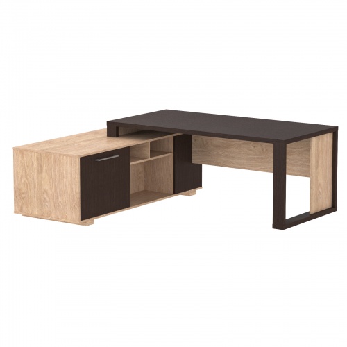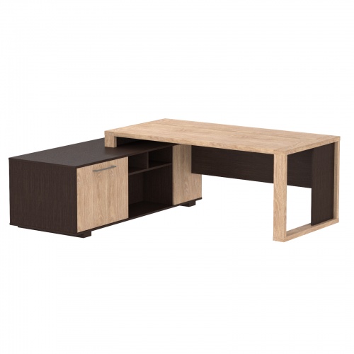 из ЛДСП т.38мм, кромка ПВХ. Фронтальная панель короткая. Стол имеет несущую тумбу с открытыми нишами и слайд-дверью. Изготавливается в комбинированном цвете.