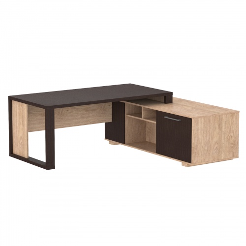 из ЛДСП т.38мм, кромка ПВХ. Фронтальная панель короткая. Стол имеет несущую тумбу с открытыми нишами и слайд-дверью. Изготавливается в комбинированном цвете.