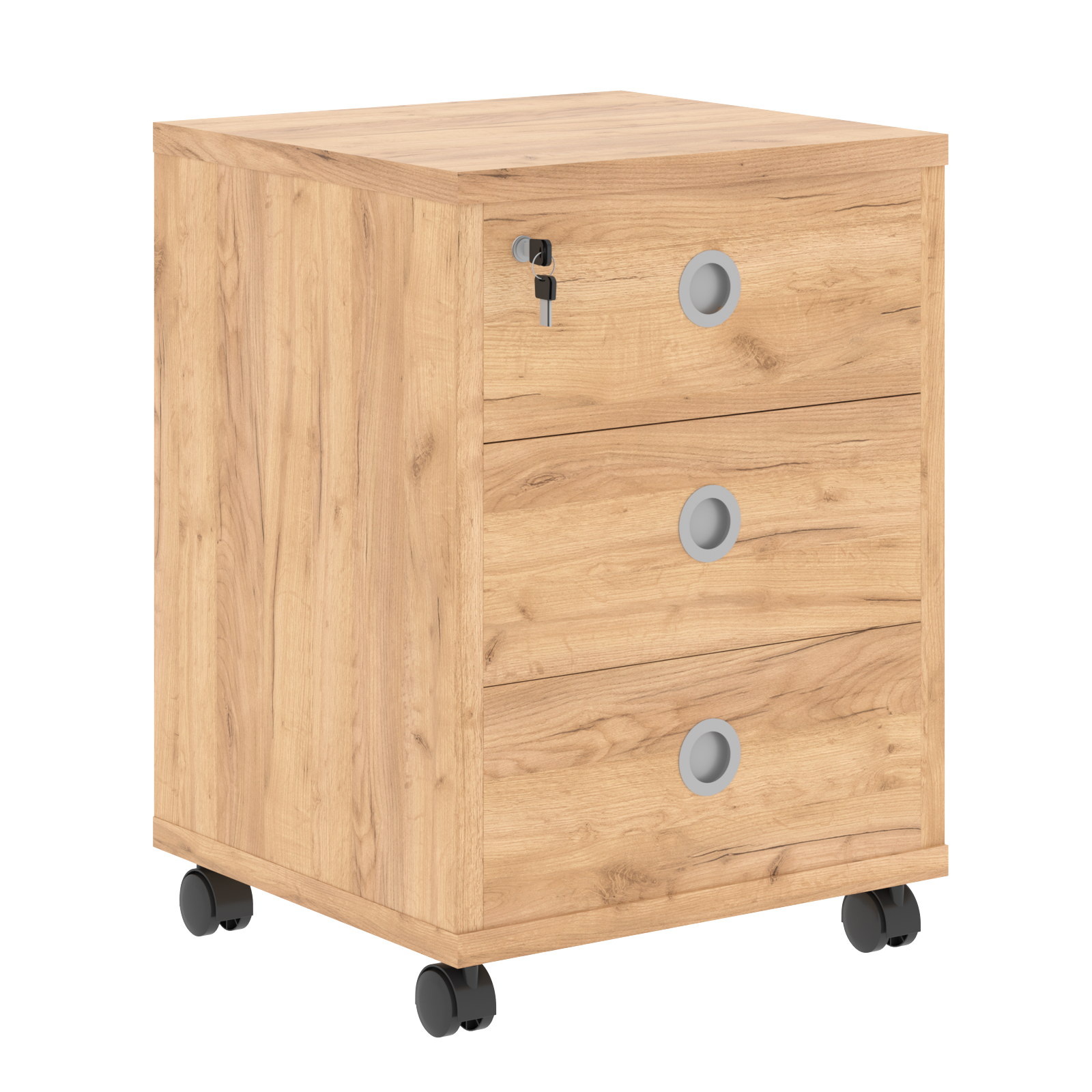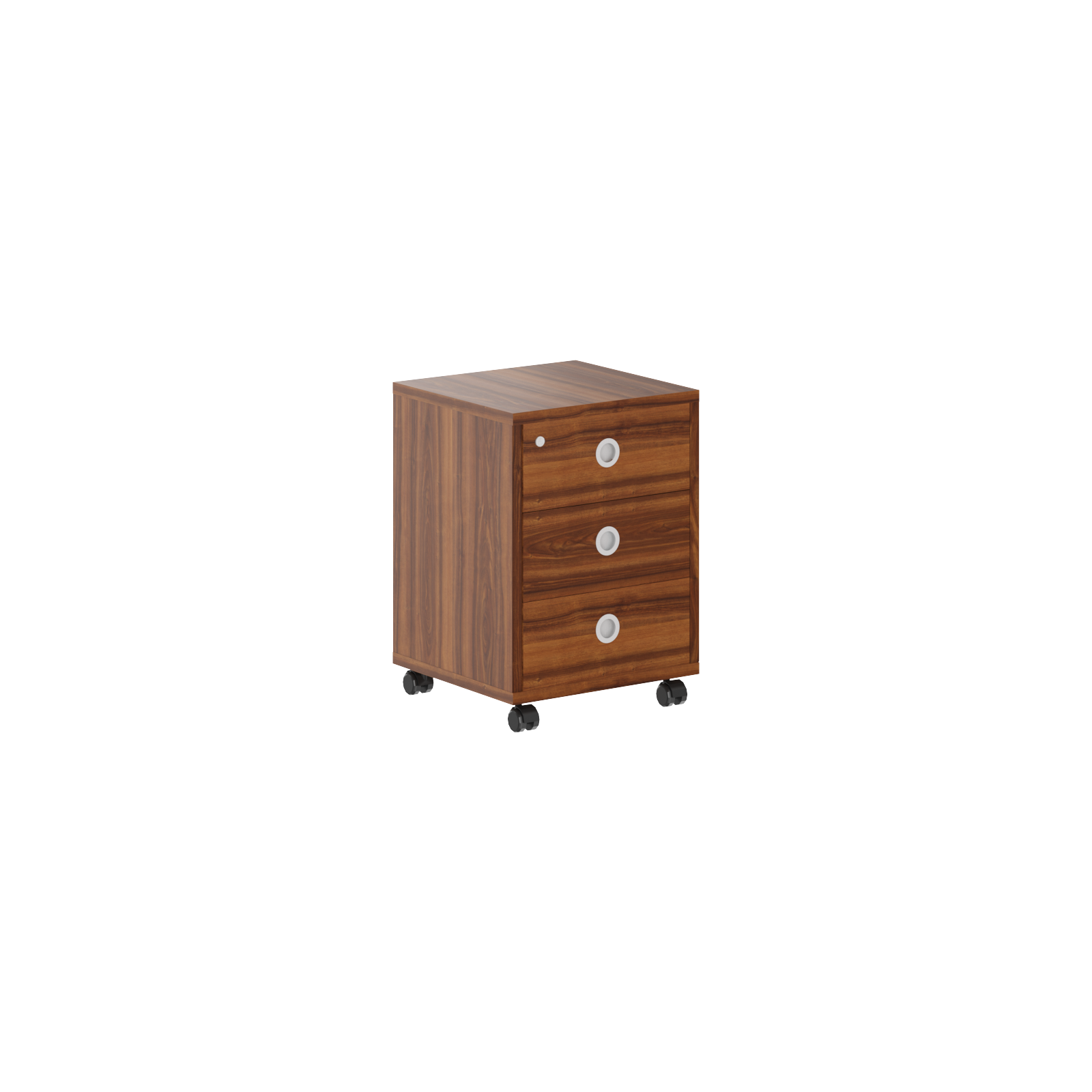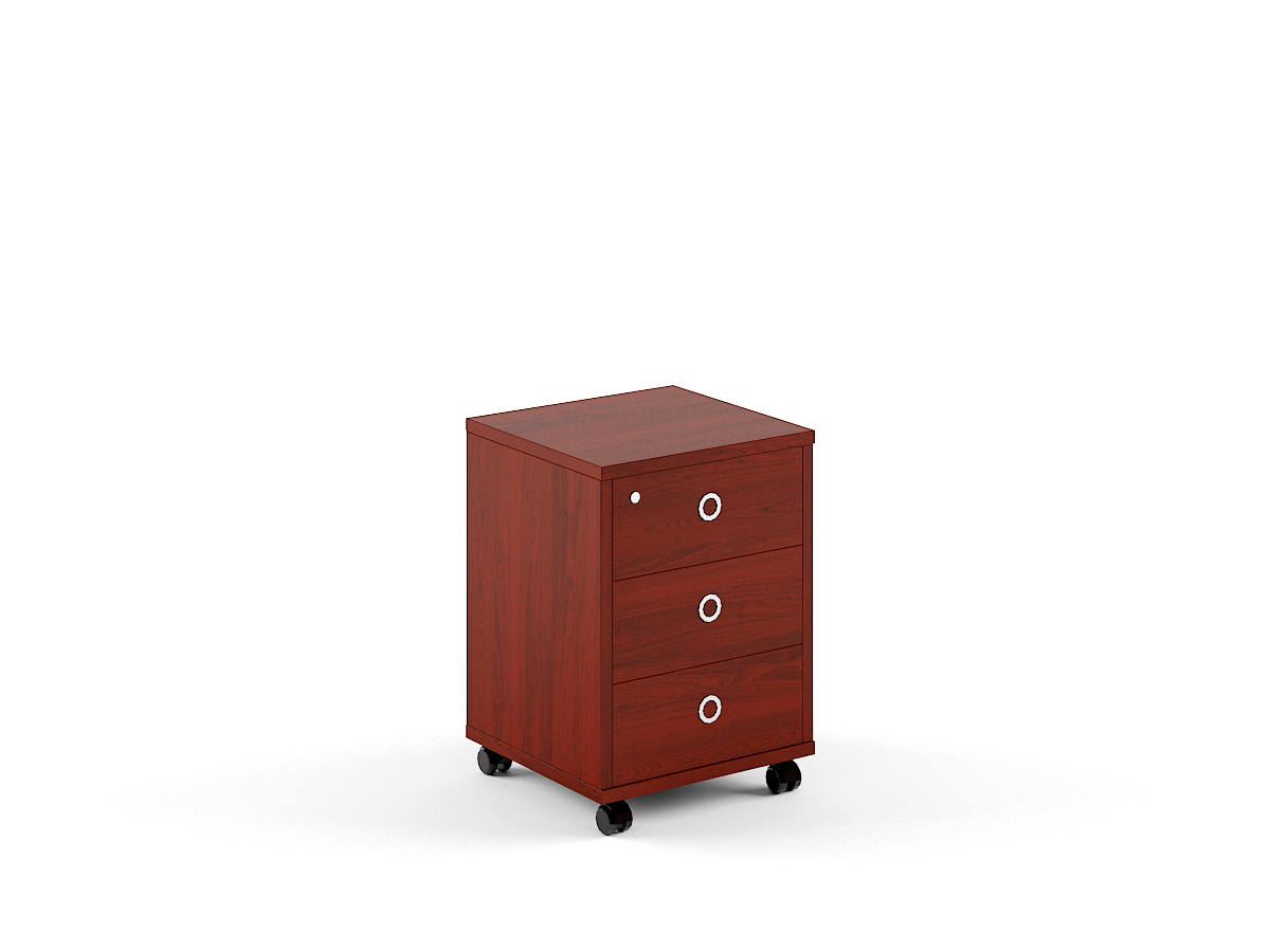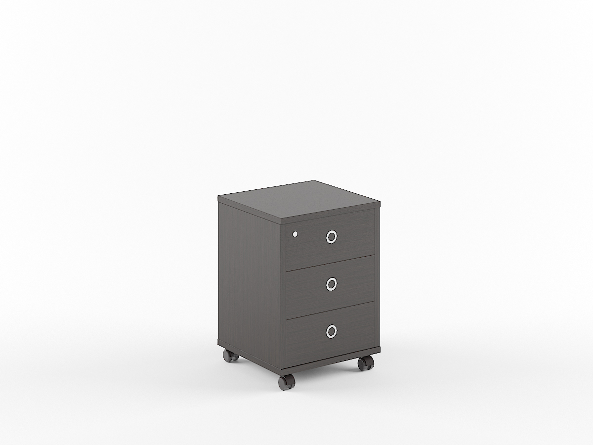 Каркас из ЛДСП т.25 мм, задняя стенка из ЛДСП т.18мм. Тумба комплектуется центральным замком на 3 ящика и колесными опорами. Ручка врезная, цвет алюминий. Ящики-фолдинги габаритом 400х399х400, роликовые направляющие.