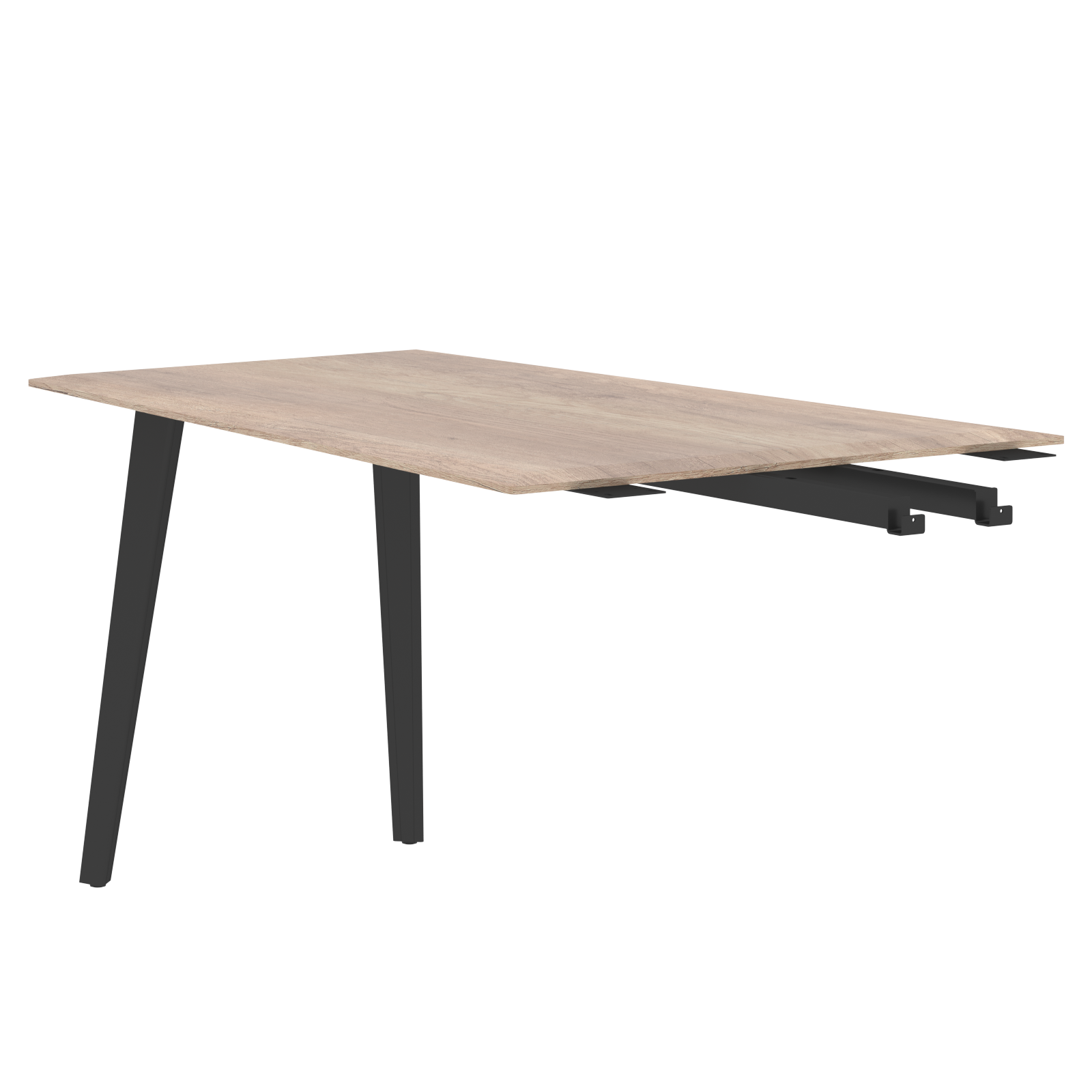 Столешница трапециевидная из одностороннего МДФ т. 19мм в пленке ПВХ с фрезеровкой по периметру, цвет - Дуб Каньон. Комплектуется металлическими опорами треугольно-конической формы, траверсами рамочного соединения и пластинами, цвет опор - Антрацит.
