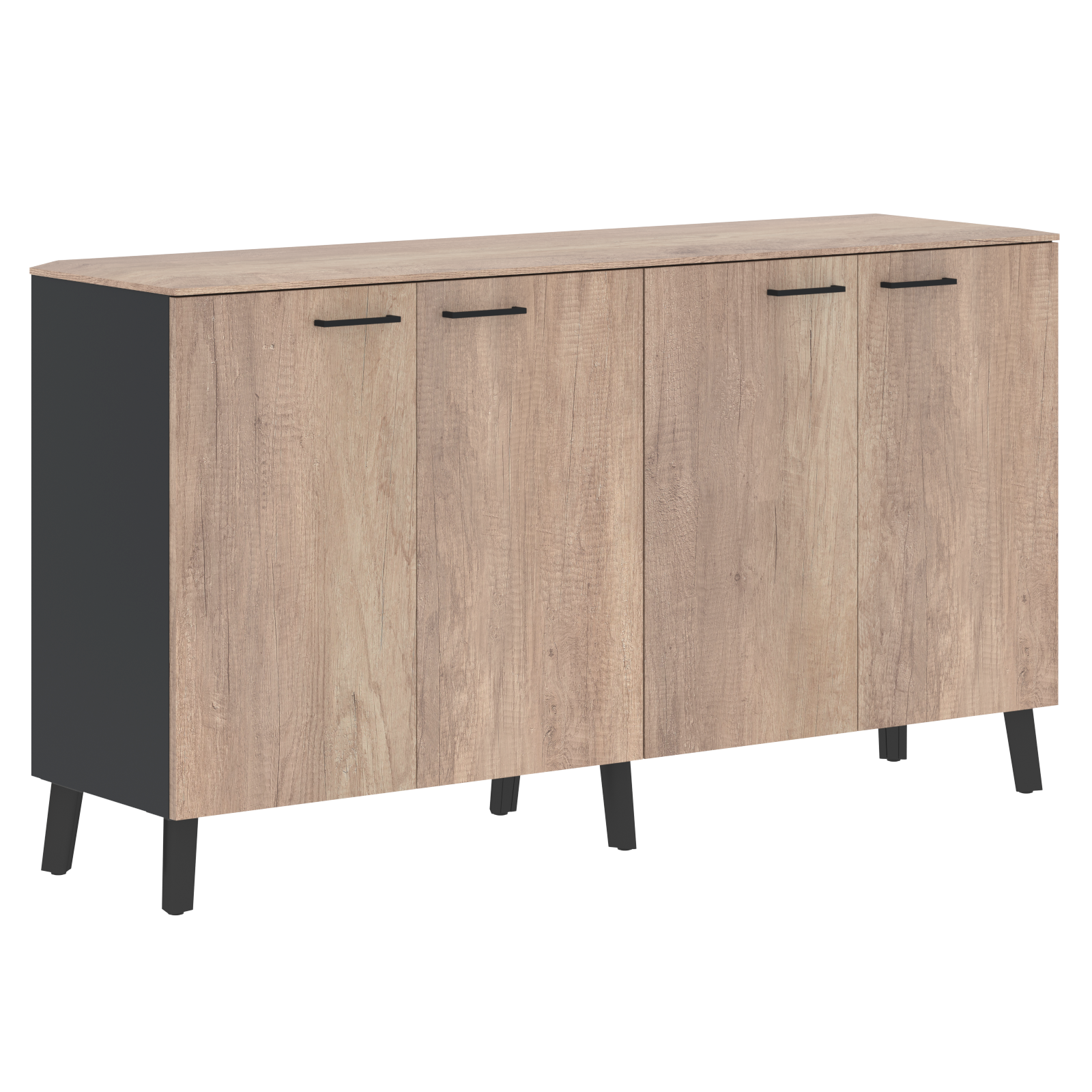 Каркас греденции из ЛДСП т.18мм, цвет - Антрацит. Двери из ЛДСП т.18мм, цвет - дуб Каньон. Комплектуется ручками-скобами черного цвета и топом из МДФ т. 19мм в пленке ПВХ с фрезеровкой, цвет - Дуб Каньон. Внутри каркаса расположены полки. Каркас греденции комплектуется фигурными металлическими опорами, высота опор - 150мм, цвет - Антрацит.