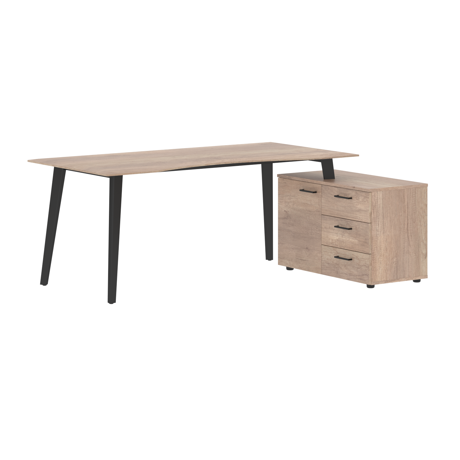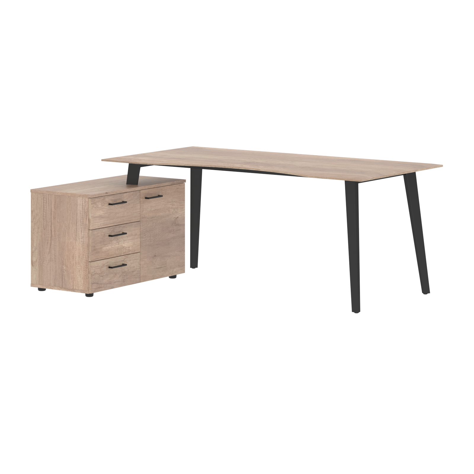 Столешница эргономичная из одностороннего МДФ т. 19мм в пленке ПВХ с фрезеровкой по периметру, цвет - Дуб Каньон. Комплектуется приставной тумбой и металлическими опорами треугольно-конической формы с траверсами рамочного соединения, цвет опор - Антрацит. Тумба из ЛДСП в цвете Дуб Каньон, имеет две секции: секция с полкой и глухой дверью, секция с 3-мя ящиками-фолдингами.