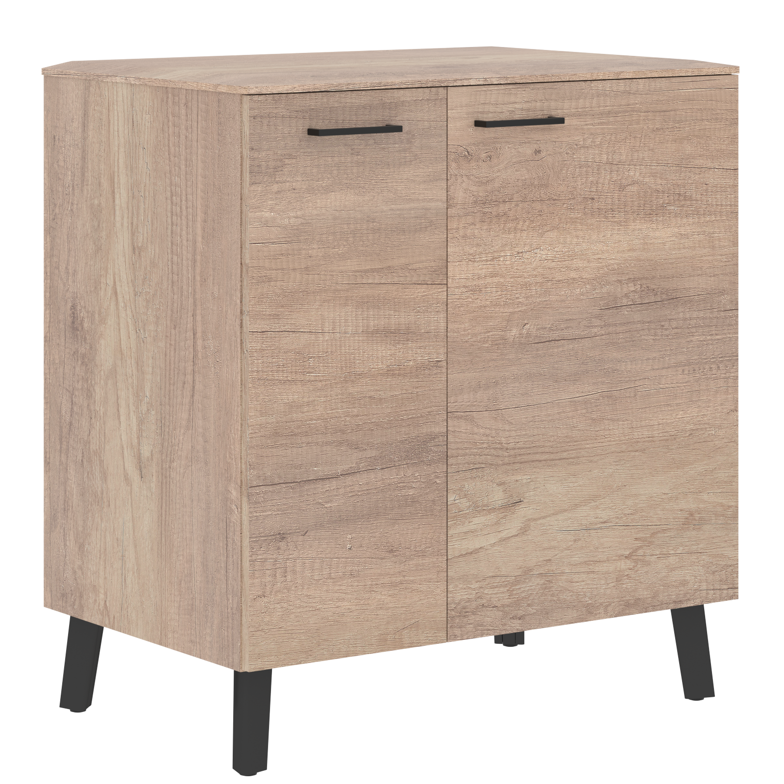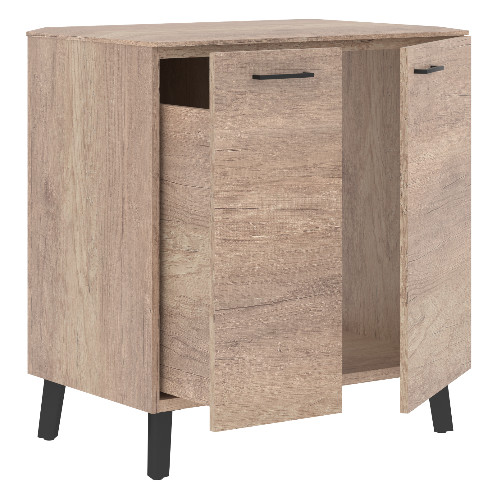 Каркас тумбы из ЛДСП т. 18мм, цвет - Антрацит. Комплектуется дверьми из ЛДСП т.18мм, цвет - Дуб Каньон, ручками-скобами черного цвета и топом из МДФ т. 19мм в пленке ПВХ с фрезеровкой, цвет - Дуб Каньон. Каркас фригобара комплектуется фигурными металлическими опорами, высота опор - 150мм, цвет - Антрацит. Тумба состоит из 2-х секций: секция под холодильник и выдвижная секция под бокалы и напитки.