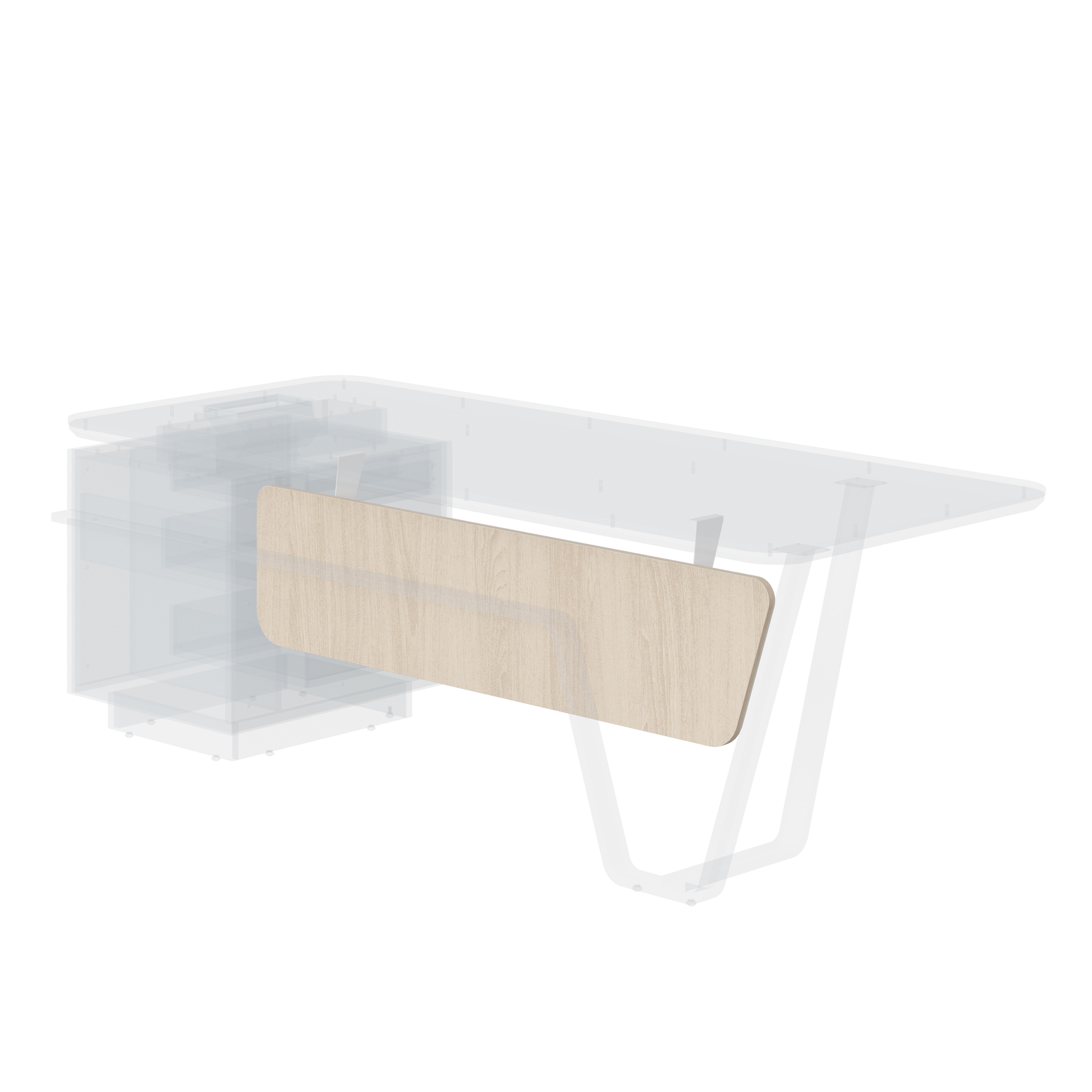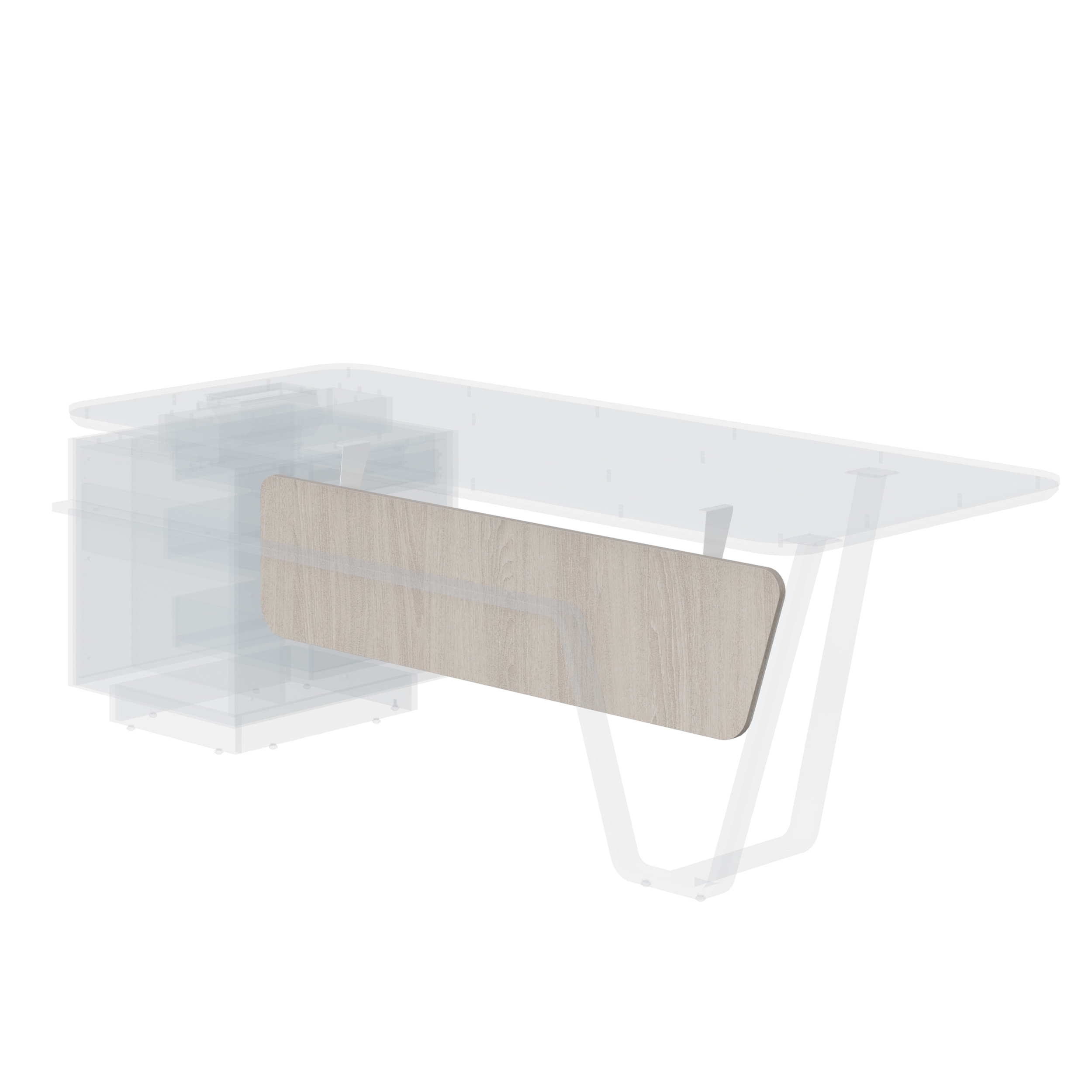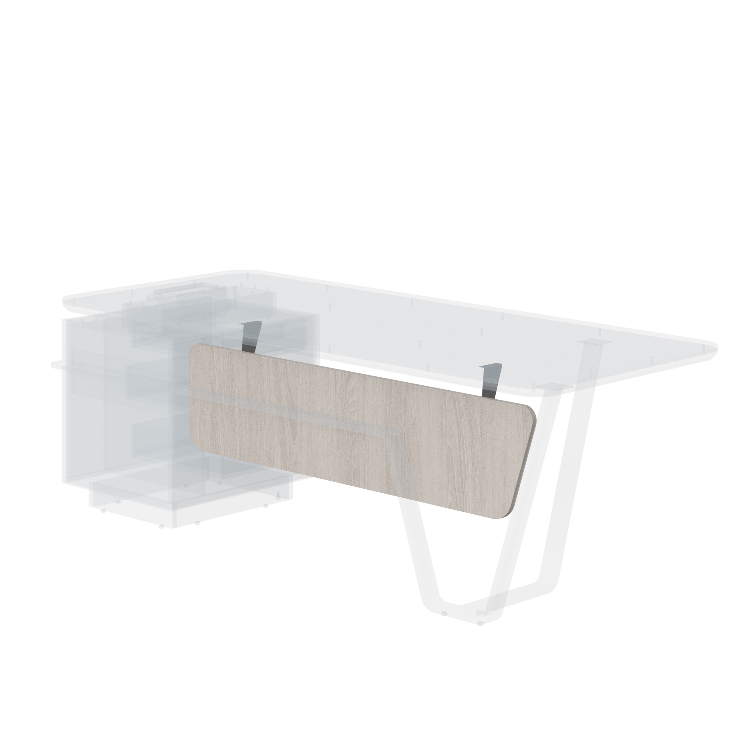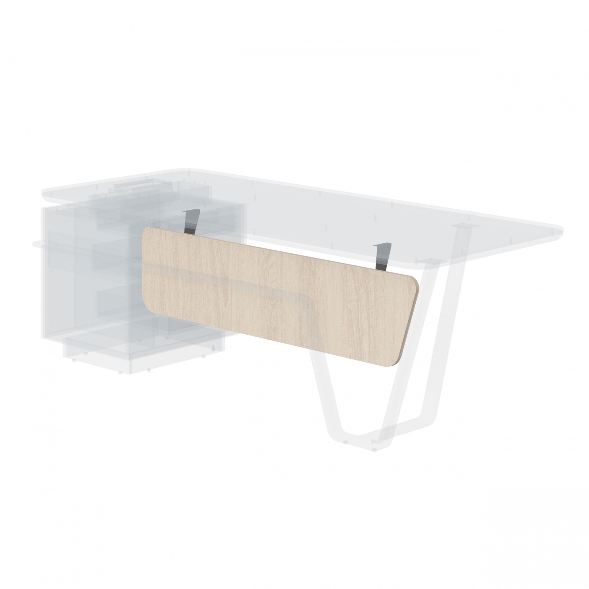 Предусмотрен правый (изображен) и левый вариант исполнения, крепление к столу на металлических кронштейнах. Кронштейны покрыты полимерной порошковой краской с эффектом «муар» в цвет металлического каркаса. Экран изготовлен из плиты МДФ 19 мм, облицованной шпоном.
