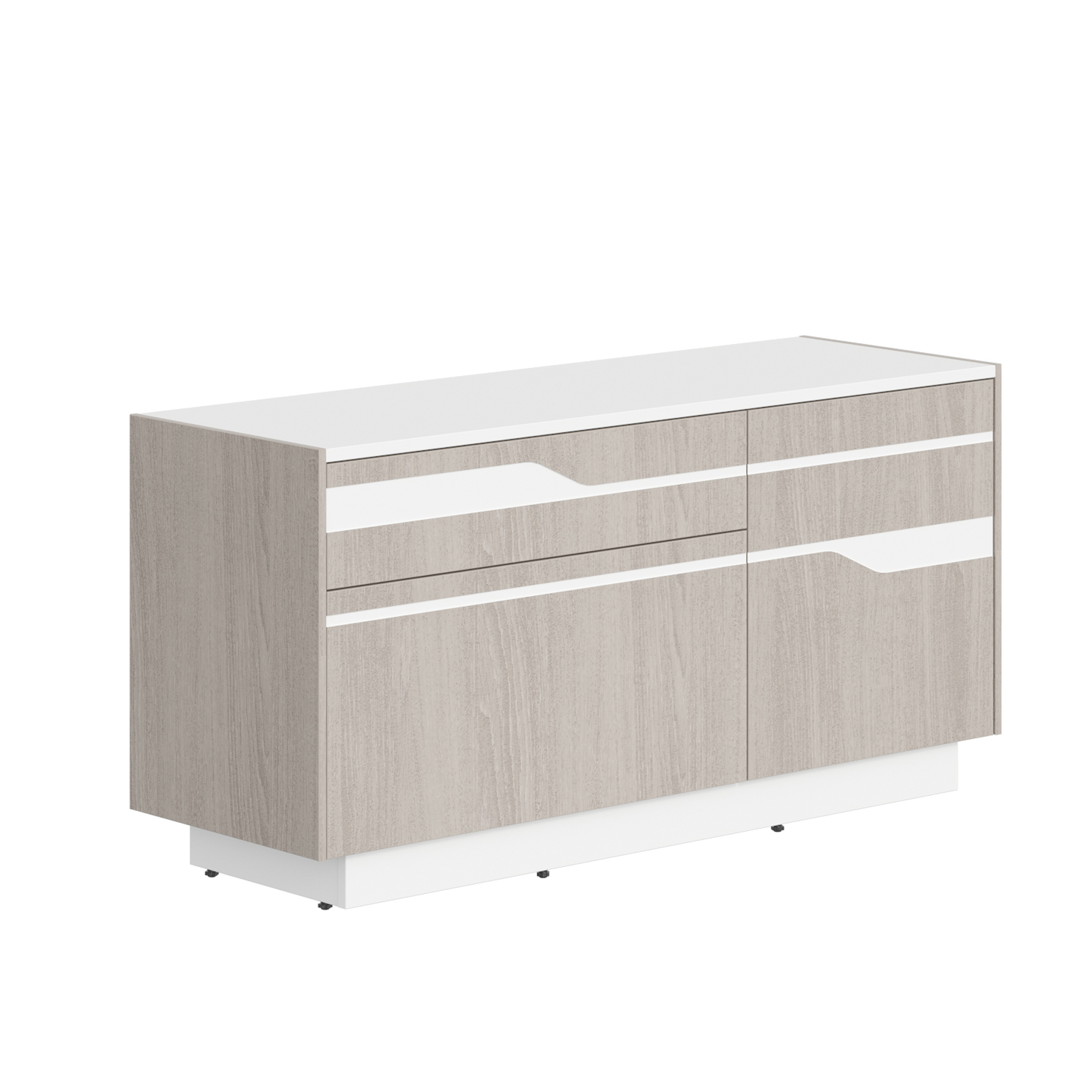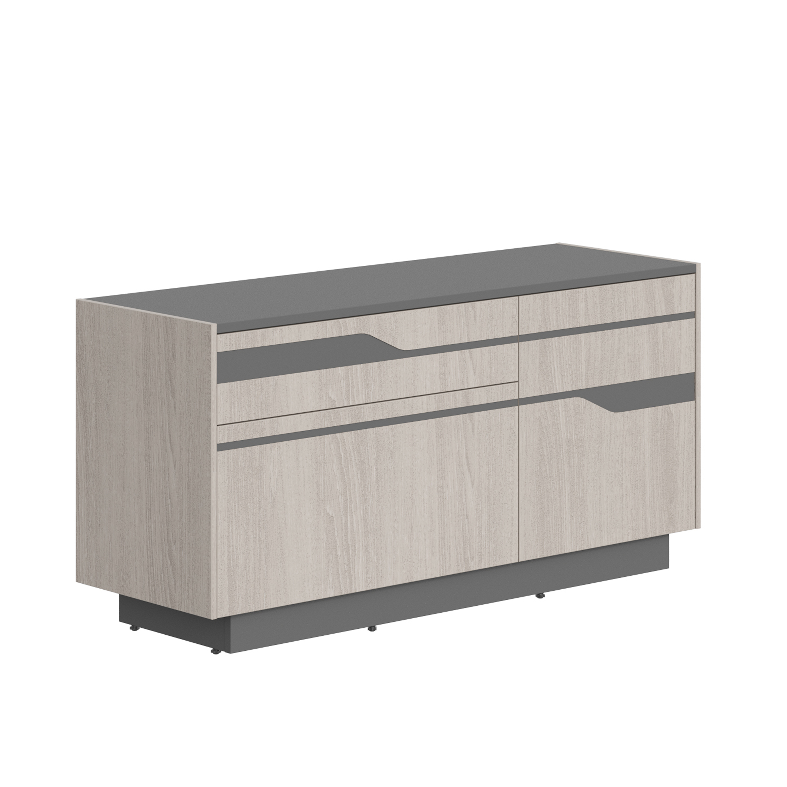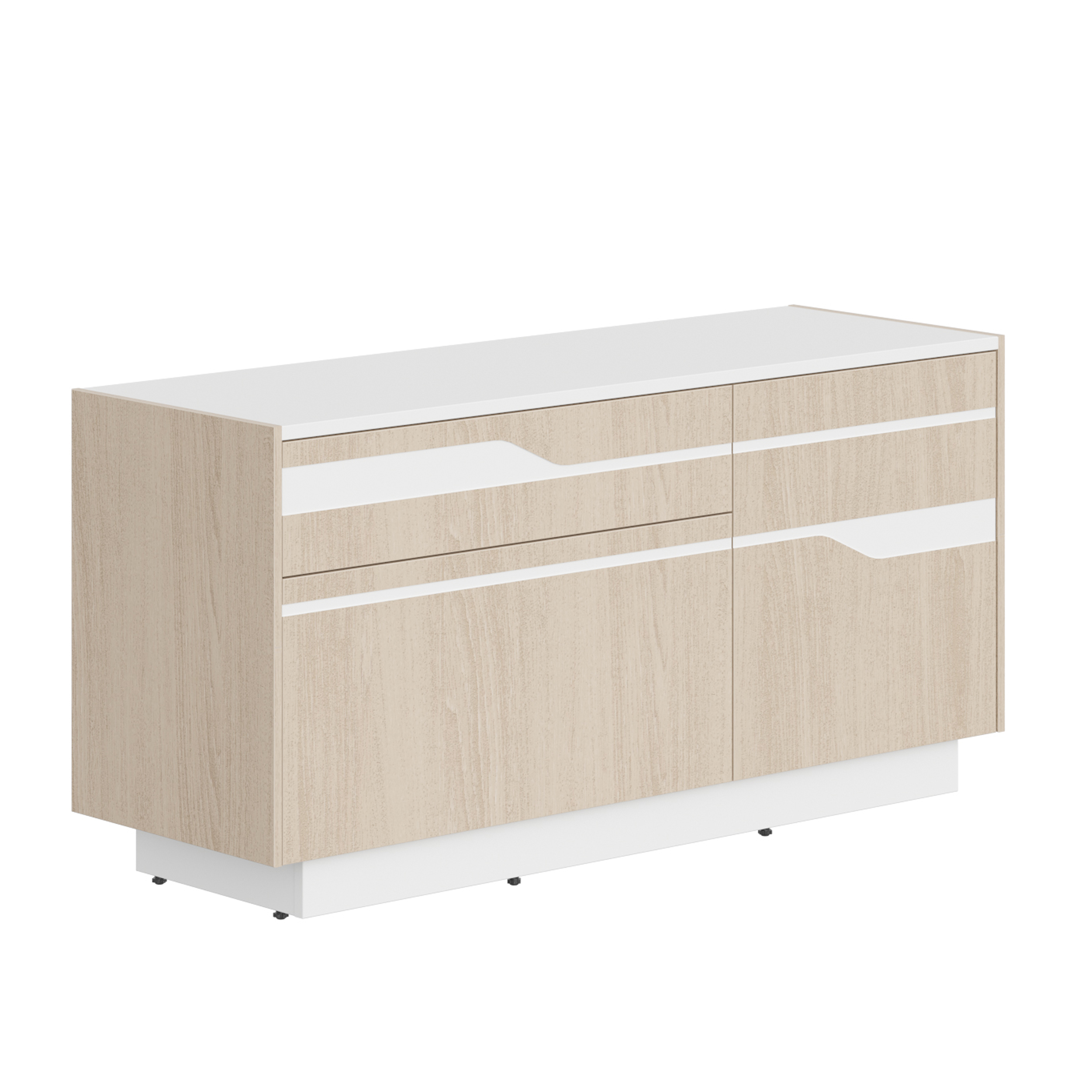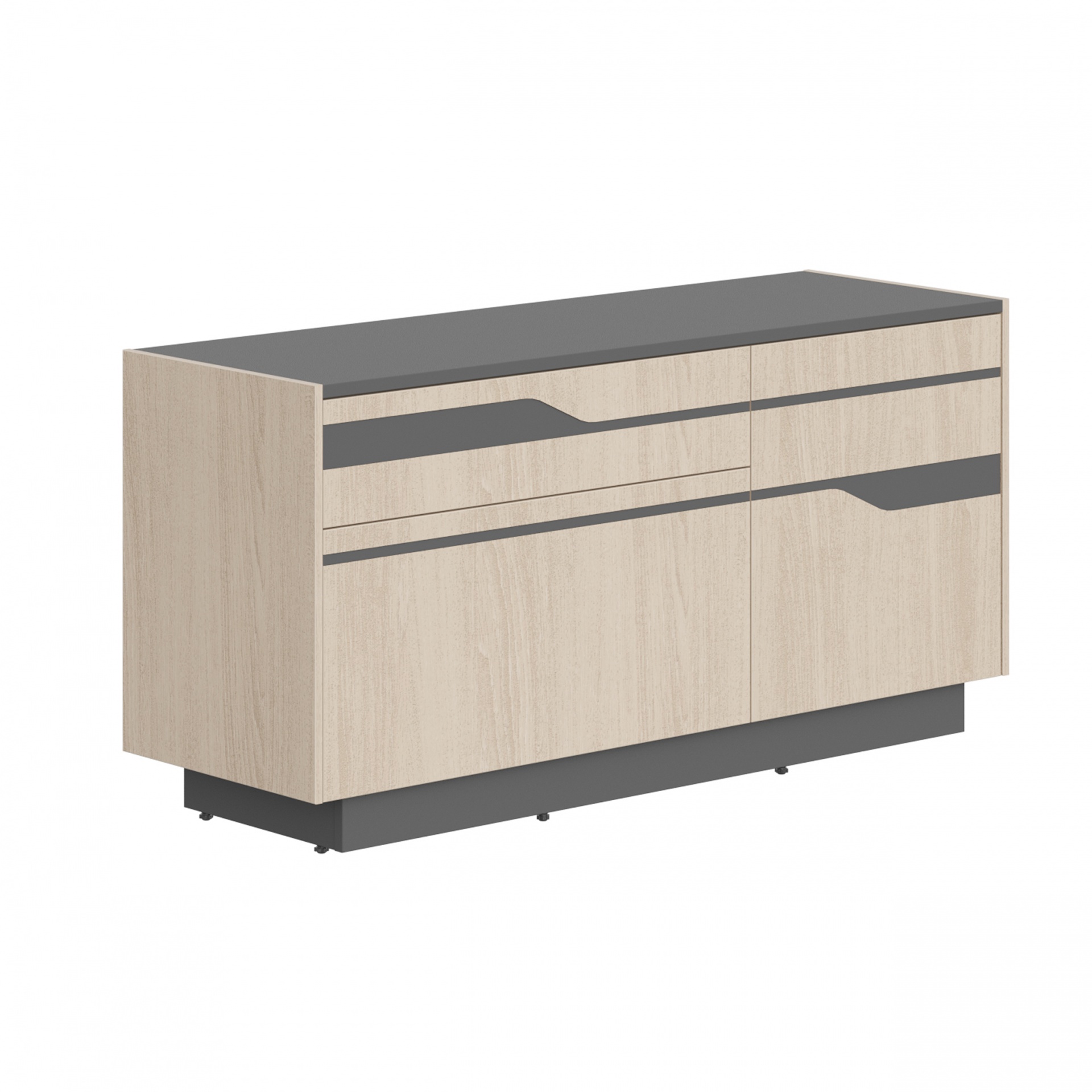 Внутренний каркас – ламинированная ДСП 18 мм, кромка ABS 0,8 мм. Наружные декоративные боковые панели – плита МДФ 12 мм, облицованная шпоном, кромка – натуральный шпон. Задняя стенка – плита ДСП 18 мм. В основании каркасов установлена цокольная коробка из плиты ДСП 18 мм. Опоры комода имеют регулировку по высоте: 0 - 12 мм. Двери - плита МДФ 19 мм, облицованная натуральным шпоном. На лицевой части фасадов нанесен декоративный фигурный рисунок по технологии фрезерования поверхности с окрашиванием фрезерованной части цветной эмалью в цвет унидекора. Для открывания распашной дверей применяются петли «push to open».