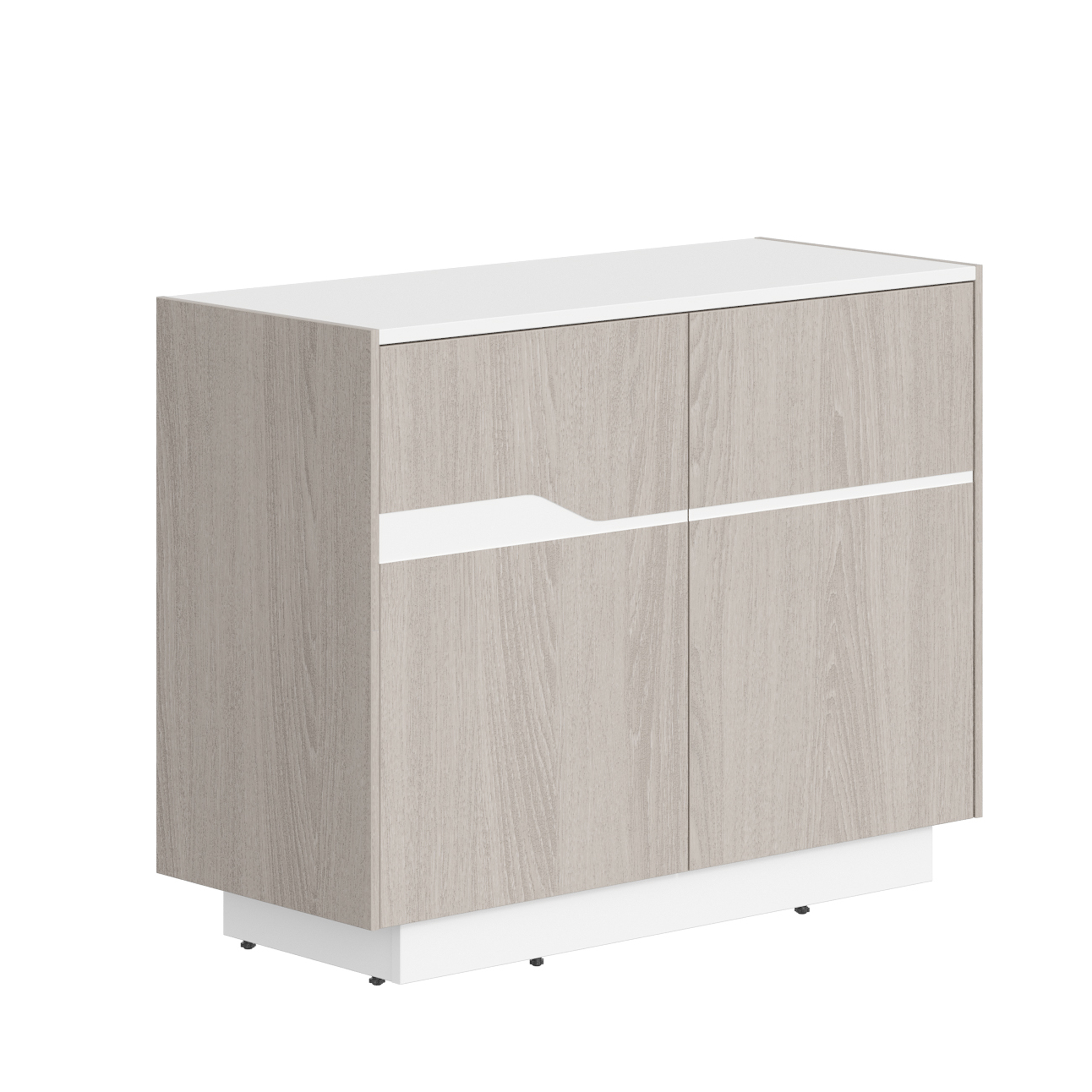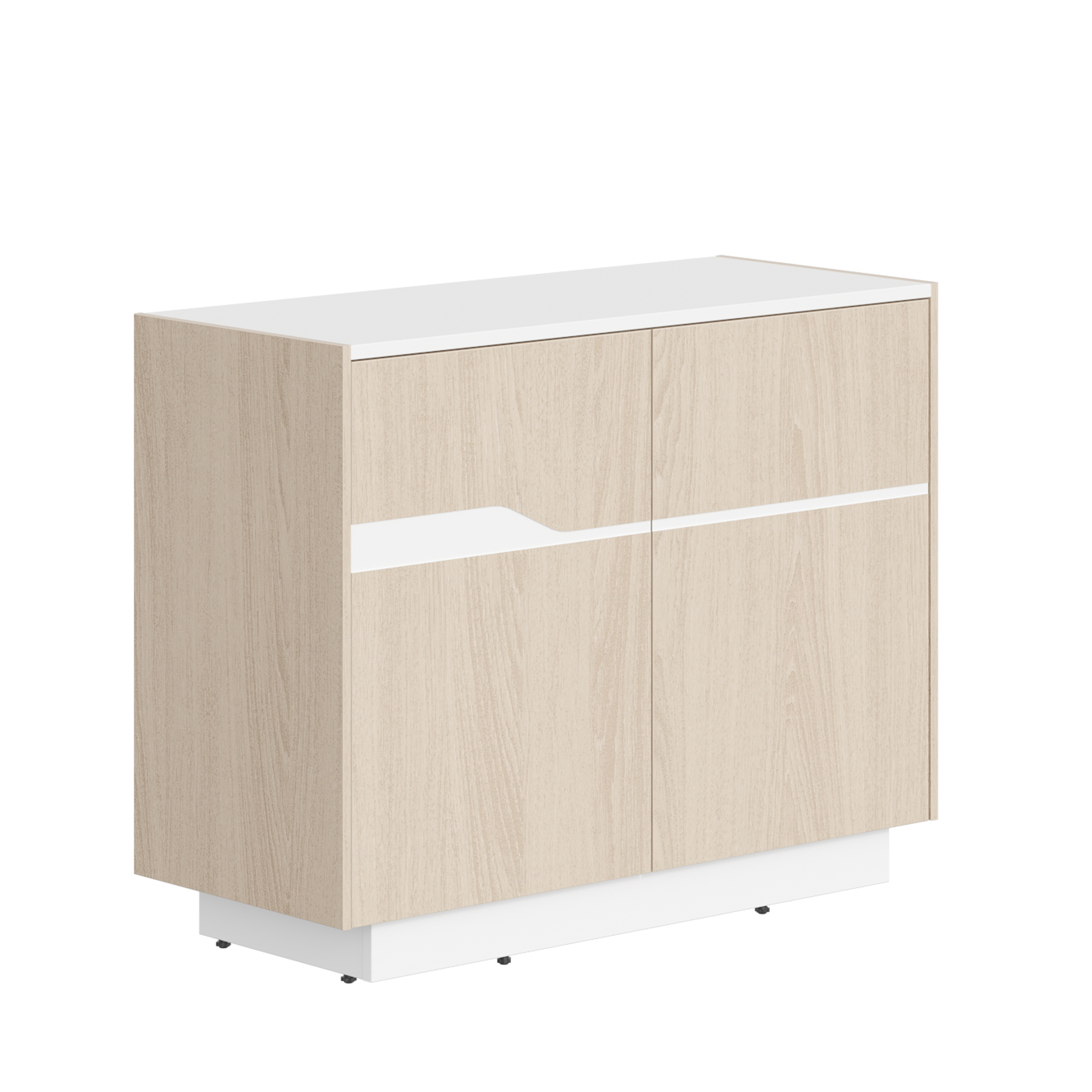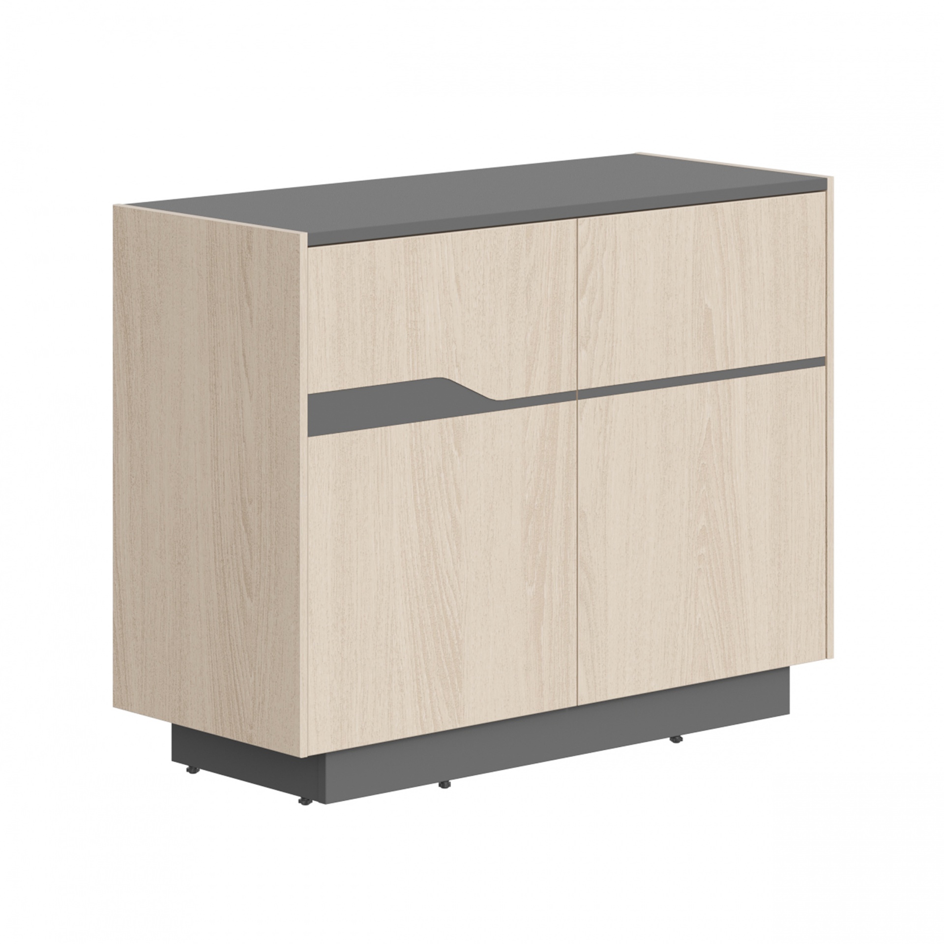 Внутренний каркас – ламинированная ДСП 18 мм, кромка ABS 0,8 мм. Наружные декоративные боковые панели – плита МДФ 12 мм, облицованная шпоном, кромка – натуральный шпон. Задняя стенка – плита ДСП 18 мм. В основании каркасов установлена цокольная коробка из плиты ДСП 18 мм. Опоры комода имеют регулировку по высоте: 0 - 12 мм. Двери - плита МДФ 19 мм, облицованная натуральным шпоном. На лицевой части фасадов нанесен декоративный фигурный рисунок по технологии фрезерования поверхности с окрашиванием фрезерованной части цветной эмалью в цвет унидекора. Для открывания дверей применяются петли системы «push to open».