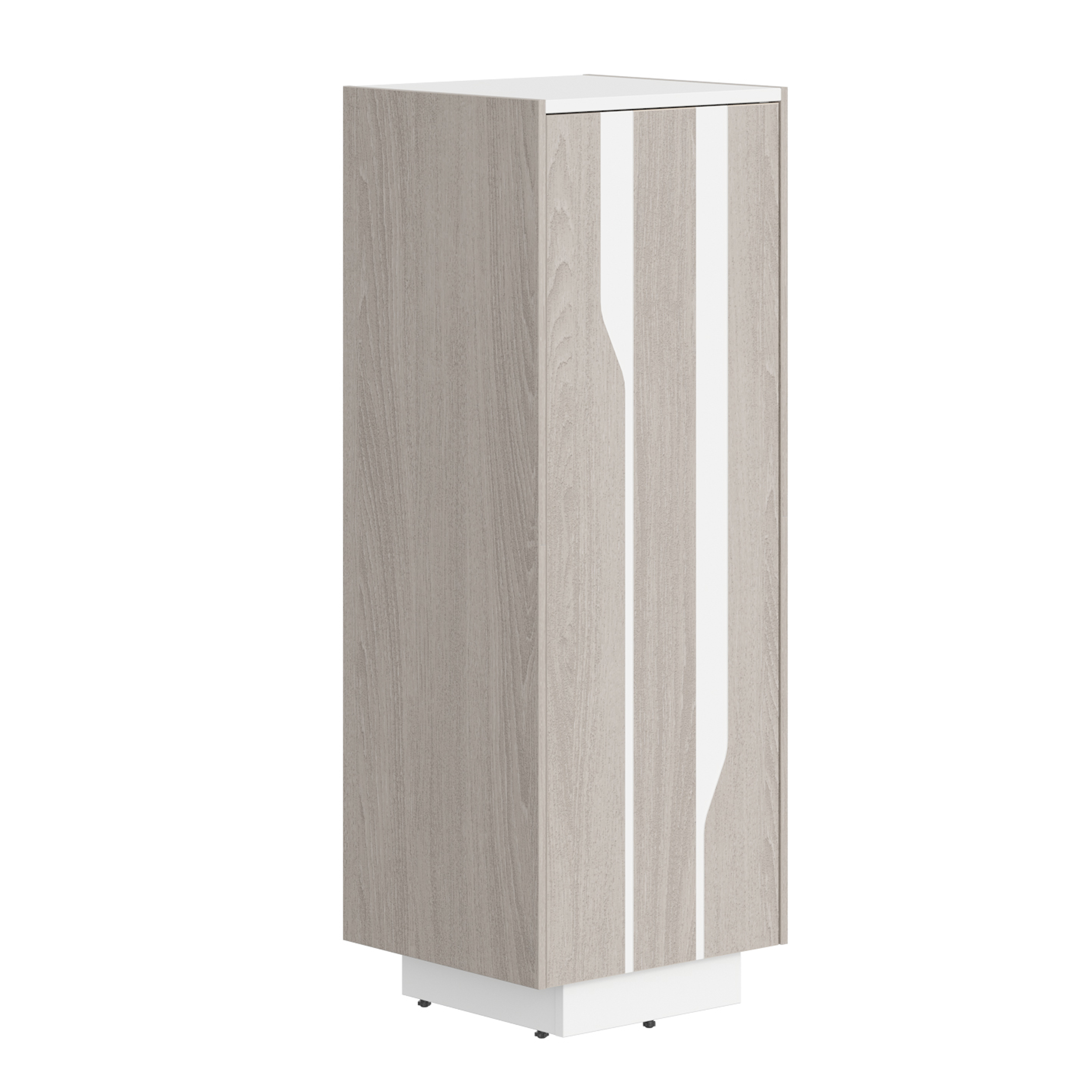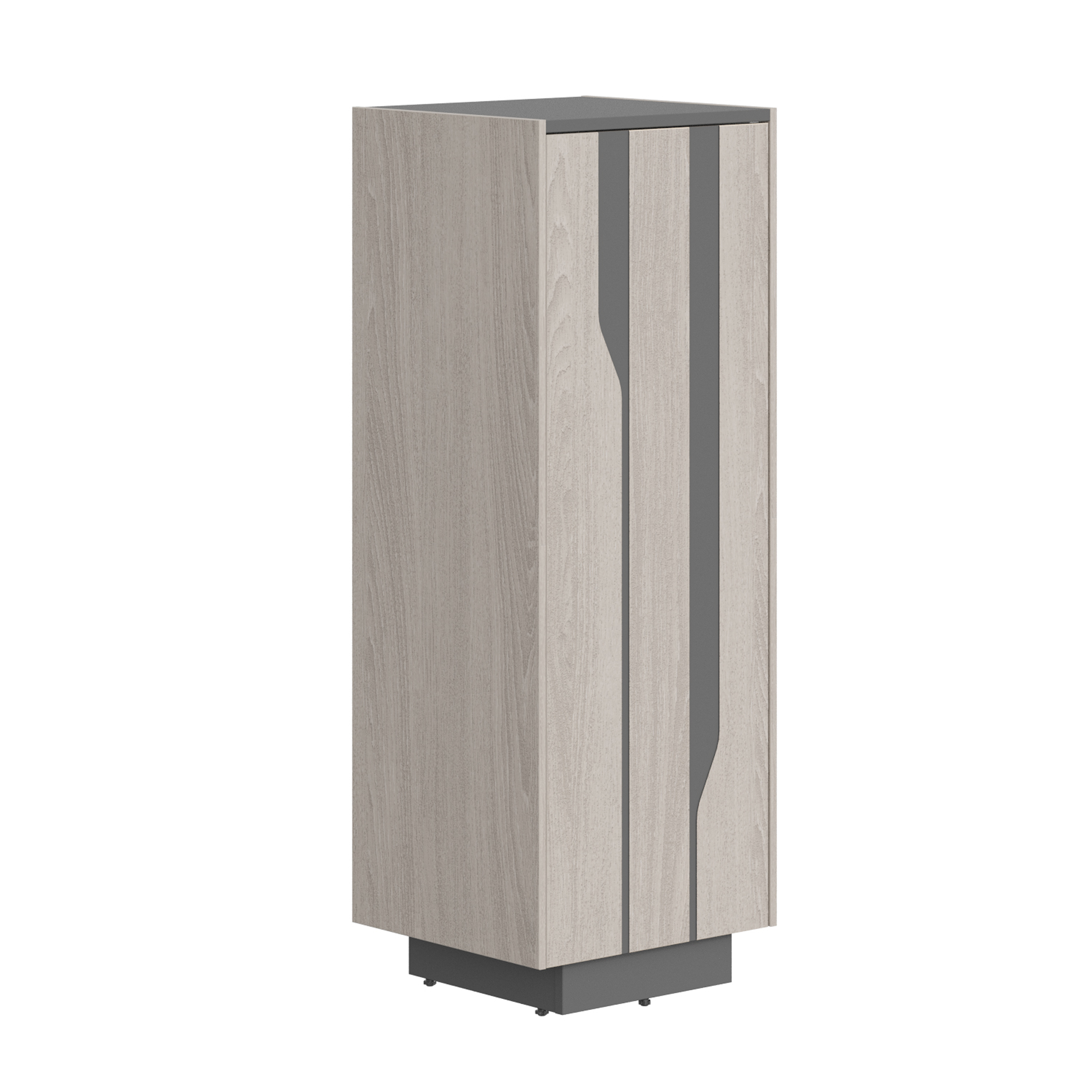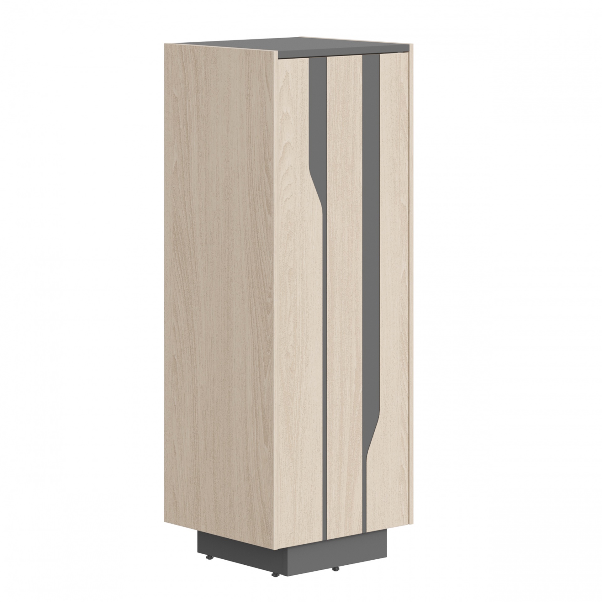 Внутренний каркас – ламинированная ДСП 18 мм, кромка ABS 0,8 мм. Наружные декоративные боковые панели – плита МДФ 12 мм, облицованная шпоном, кромка – натуральный шпон. Задняя стенка – плита ДСП 18 мм. В основании каркасов установлена цокольная коробка из плиты ДСП 18 мм. Опоры шкафа имеют регулировку по высоте: 0 - 12 мм. Двери - плита МДФ 19 мм, облицованная натуральным шпоном. На лицевой части фасада нанесен декоративный фигурный рисунок по технологии фрезерования поверхности с окрашиванием фрезерованной части цветной эмалью в цвет унидекора. Для открывания распашной дверей применяются петли системы «push to open».