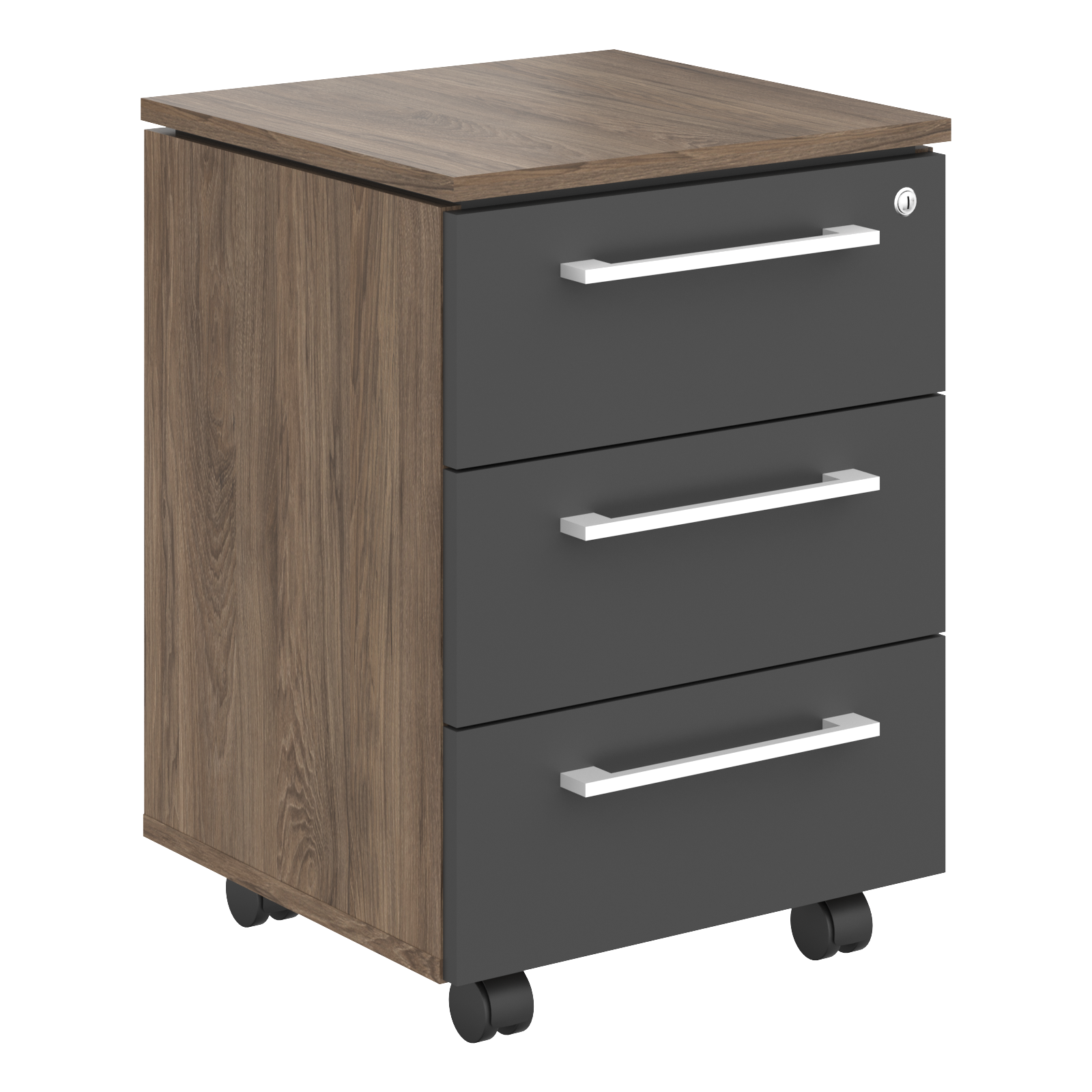 Каркас тумбы и топ в цвете Кария Пальмира, фасады в цвете Антрацит. Комплектуется центральным замком, ручкой черного цвета с межцентровым расстоянием 256мм и колесной опорой. Ящики-фолдинги размером 400х399х400, шариковые направляющие.