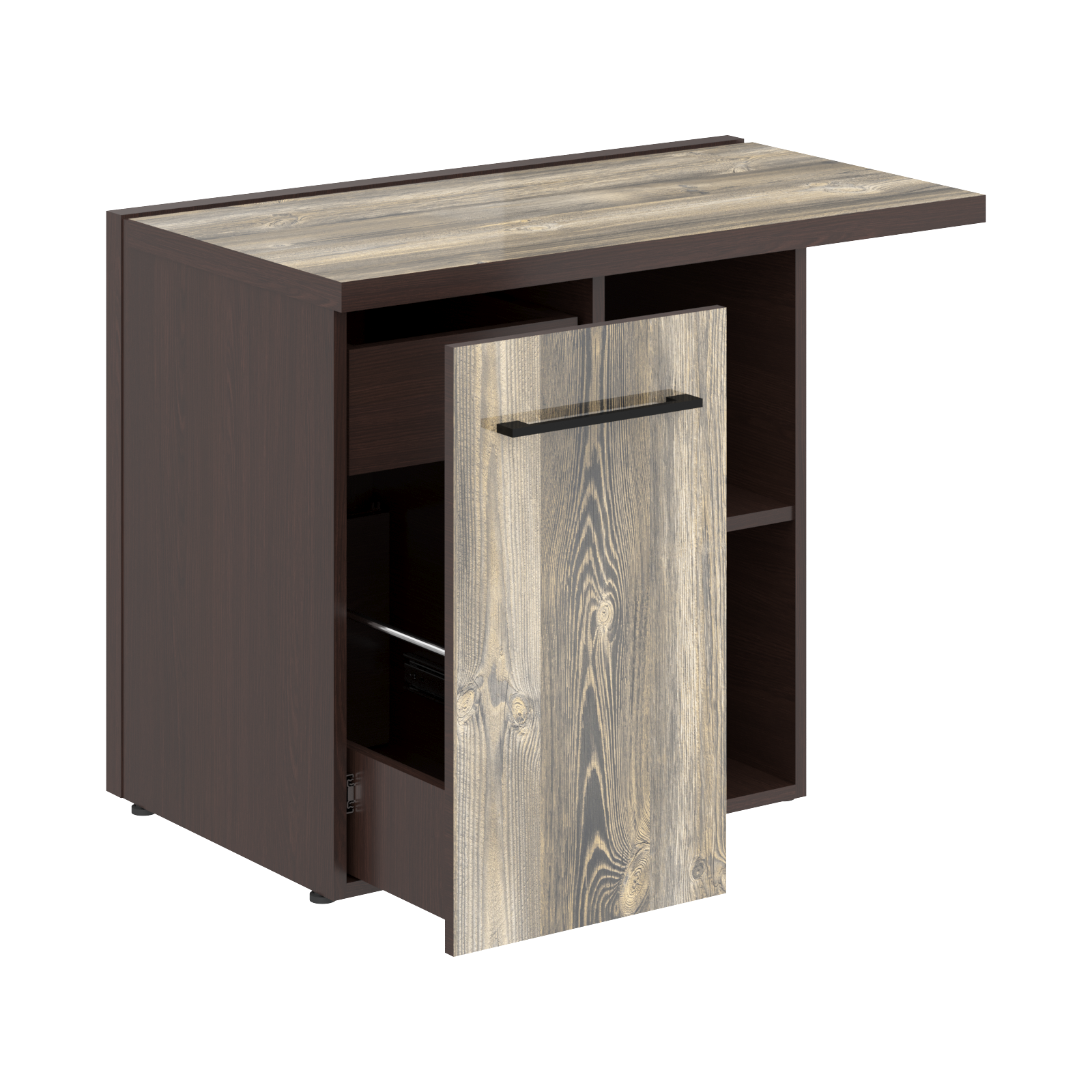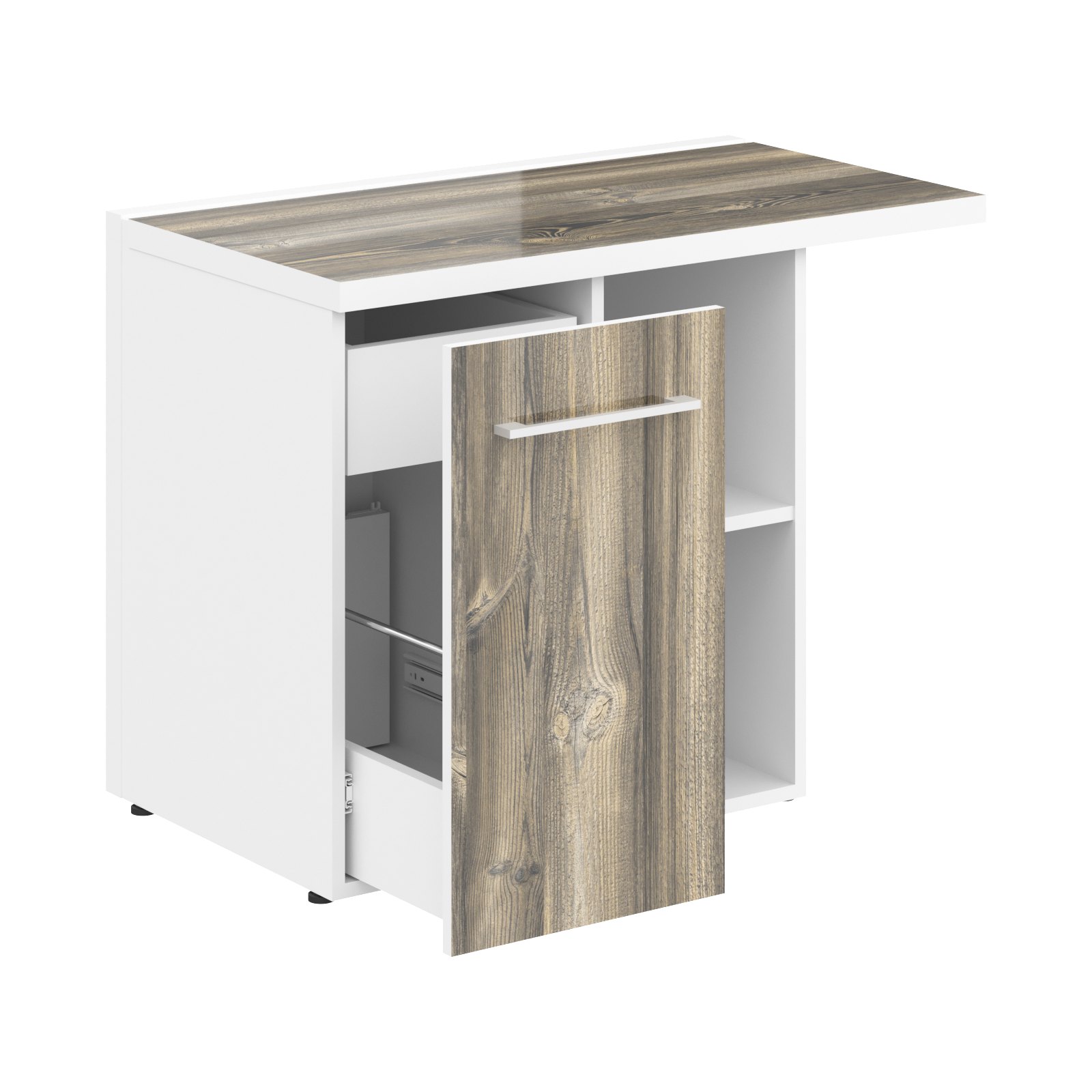 Тумба приставная для создания углового стола с выдвижной секцией. Столешница и фасады дверей глянцевые. Ящики из ЛДСП, шариковые направляющие.