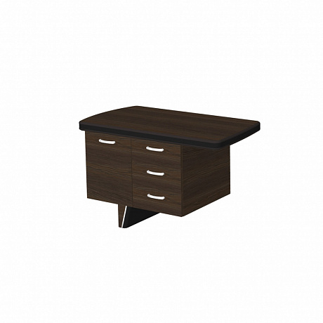 Левая боковая приставка стола New.Tone NT-12 L выполнена из шпонированного МДФ. Торцы столешницы с эмалевым покрытием декорированы вставками из экокожи. Опора со съемной панелью, обтянутой экокожей, декорирована хромированным молдингом. Ручки дверцы и выдвижных ящиков — из хромированного металла. Днища выдвижных ящиков в тумбах имеют отделку из экокожи.