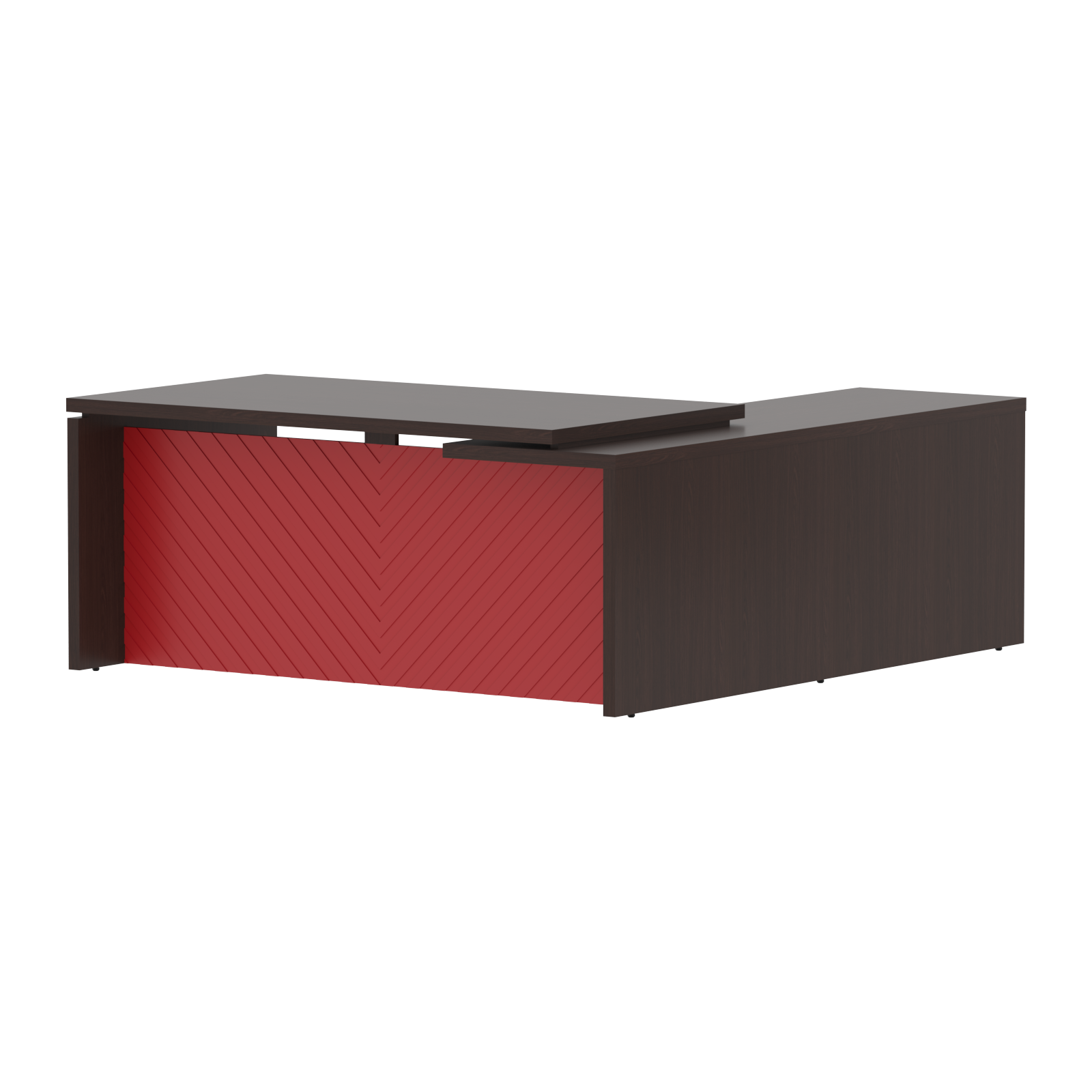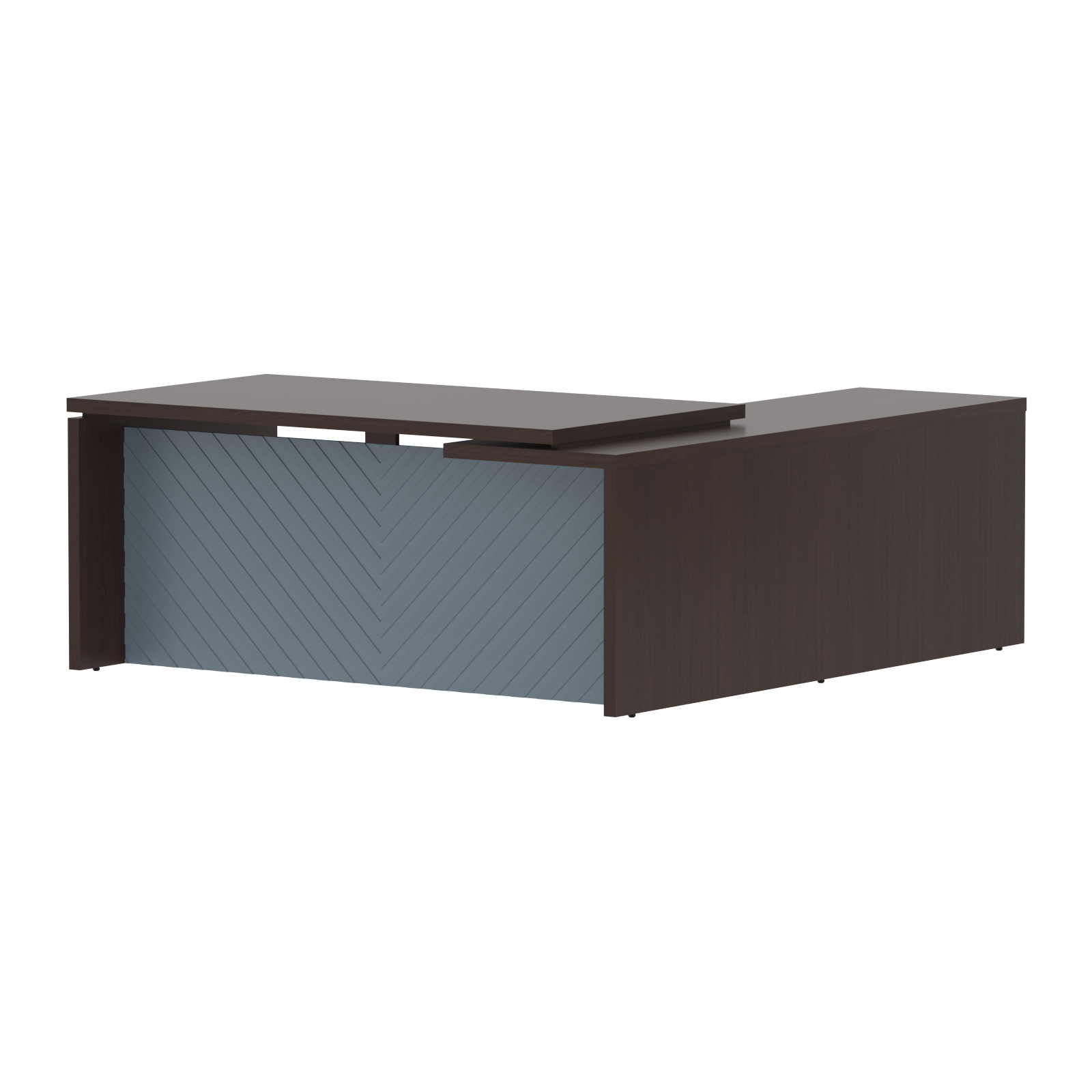 Столешница и опоры из ЛДСП толщиной 38мм с кромкой ПВХ т.2мм в цвет ЛДСП, расположение левое, правое. Стол комплектуется регулируемыми опорами. Фронтальная панель из одностороннего МДФ т.19мм фрезерованного крашенного матовой эмалью, высотой до пола h=640мм.