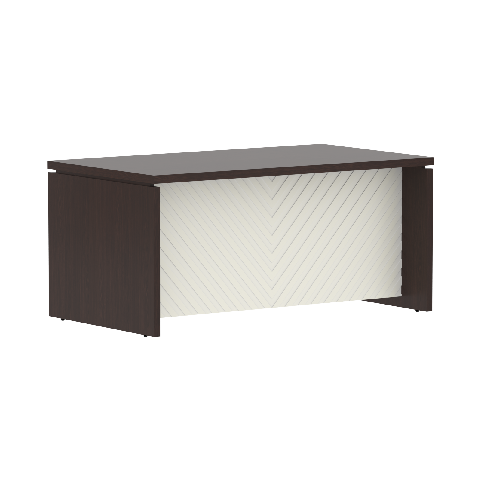 Столешница и опоры из ЛДСП толщиной 38мм с кромкой ПВХ т.2мм в цвет ЛДСП. Стол комплектуется регулируемыми опорами. Фронтальная панель из одностороннего МДФ т.19мм фрезерованного крашенного матовой эмалью, высотой до пола h=640мм.