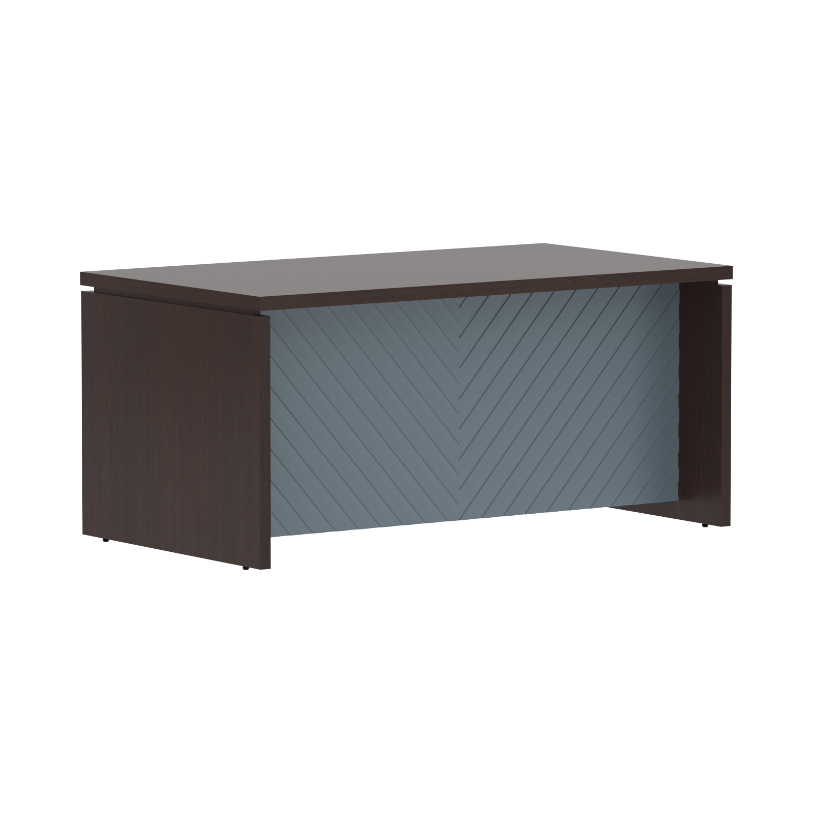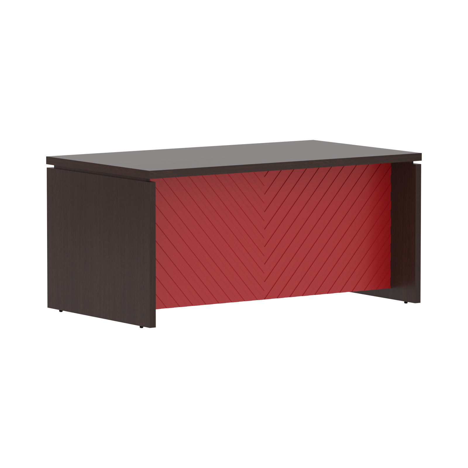 Столешница и опоры из ЛДСП толщиной 38мм с кромкой ПВХ т.2мм в цвет ЛДСП. Стол комплектуется регулируемыми опорами. Фронтальная панель из одностороннего МДФ т.19мм фрезерованного крашенного матовой эмалью, высотой до пола h=640мм.
