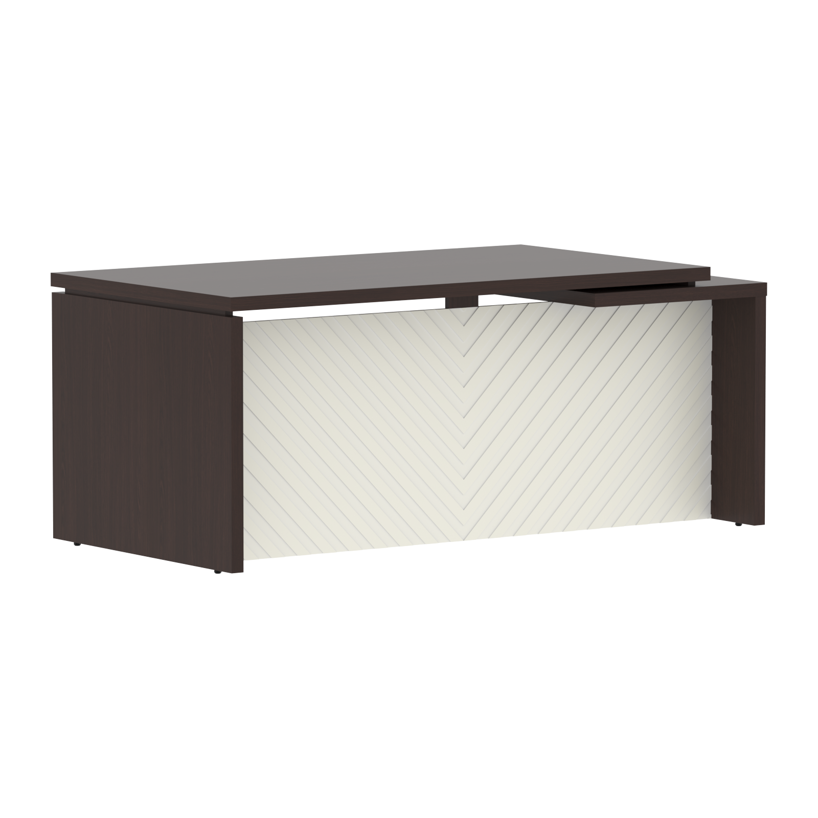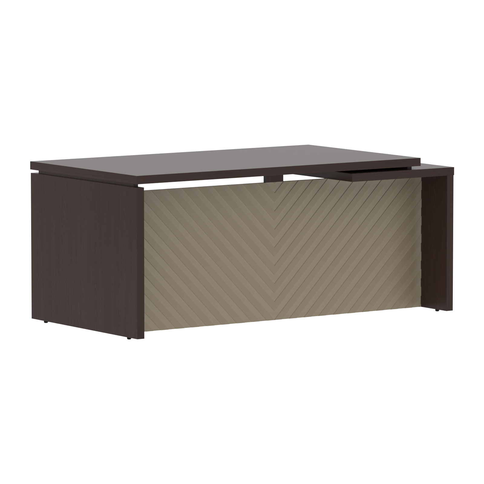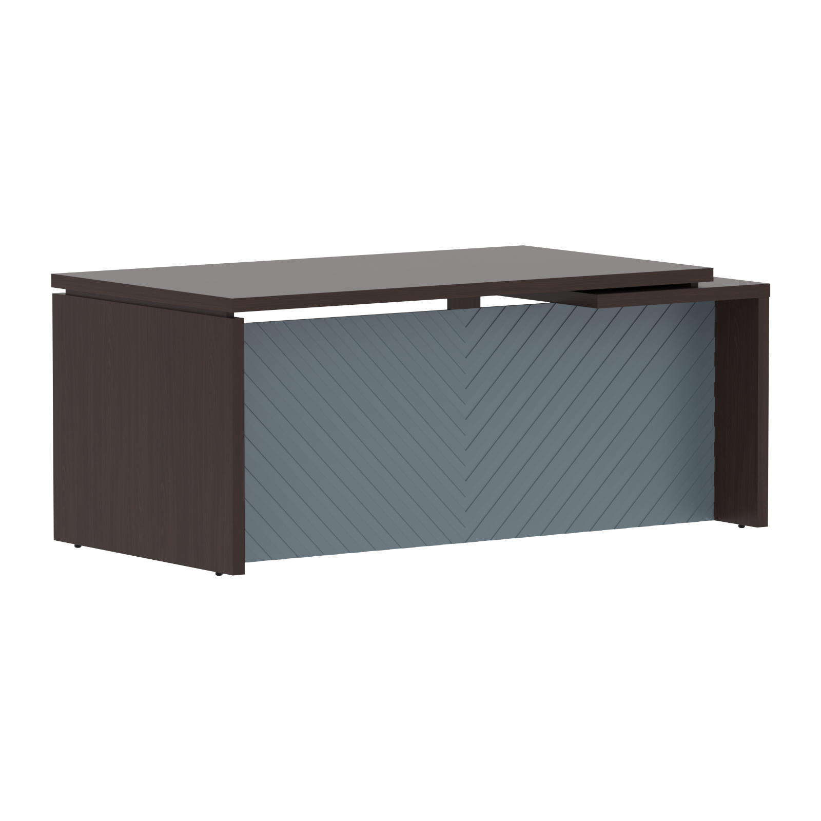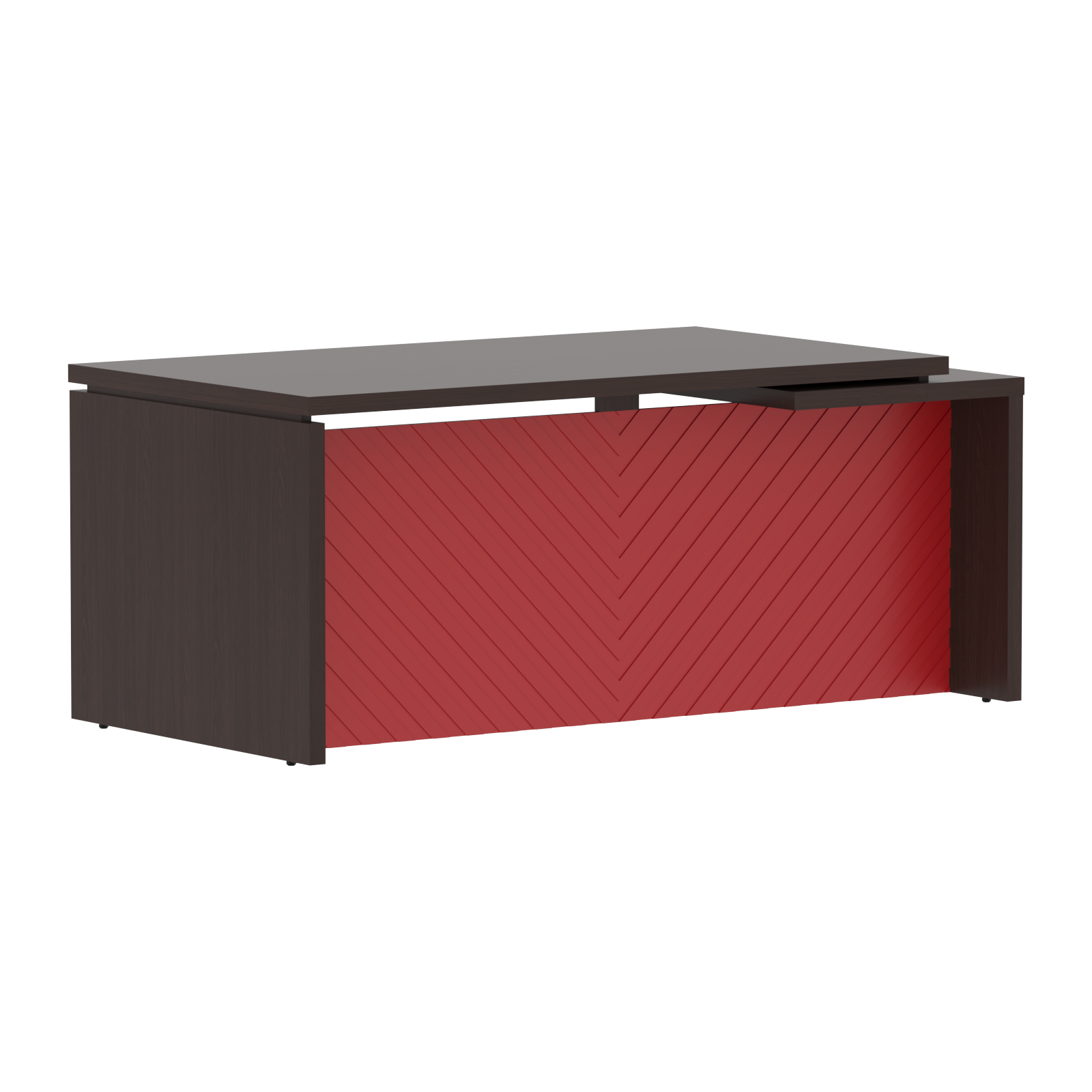 Столешница и опоры из ЛДСП толщиной 38мм с кромкой ПВХ т.2мм в цвет ЛДСП, расположение левое, правое. Стол комплектуется регулируемыми опорами. Фронтальная панель из одностороннего МДФ т.19мм фрезерованного крашенного матовой эмалью, высотой до пола h=640мм.