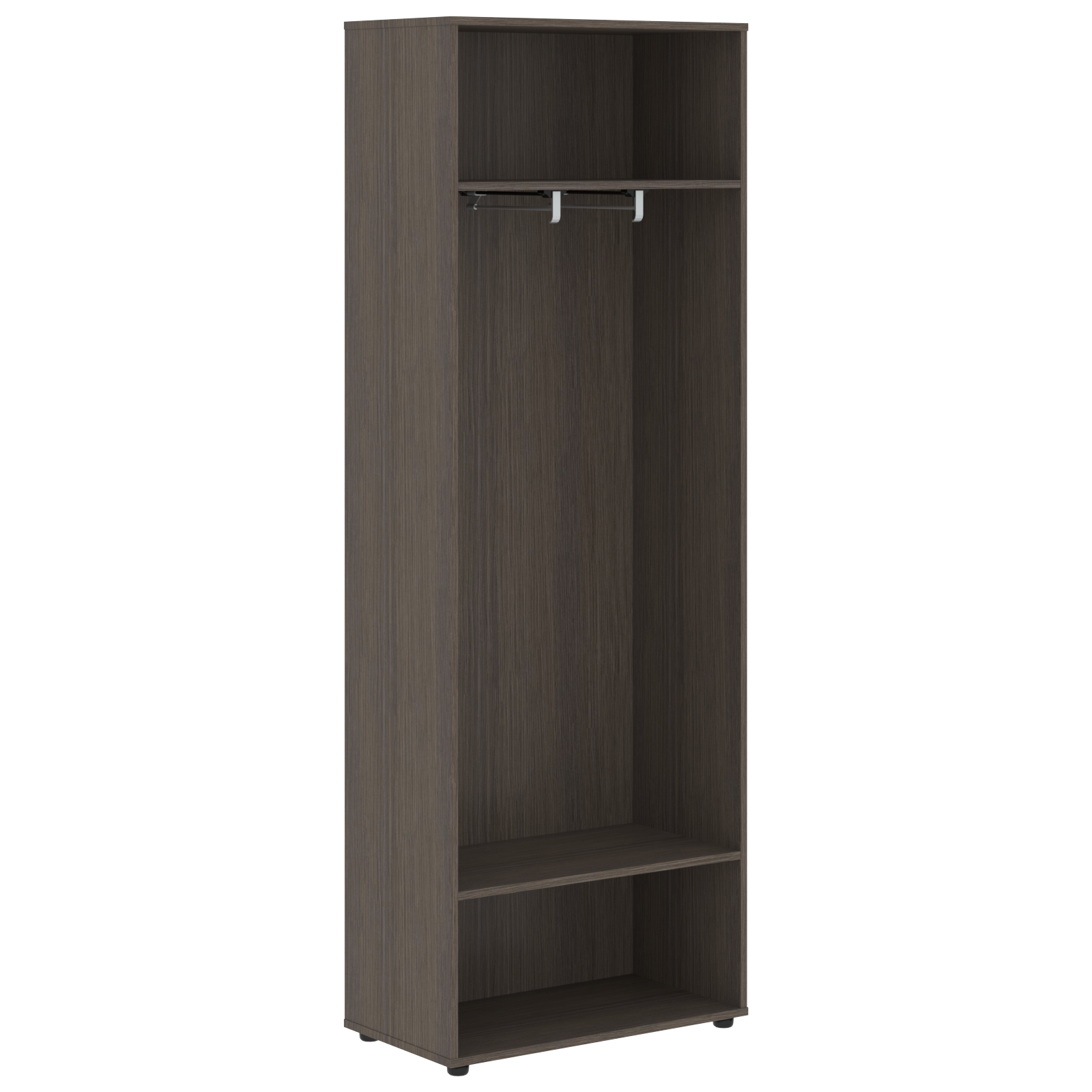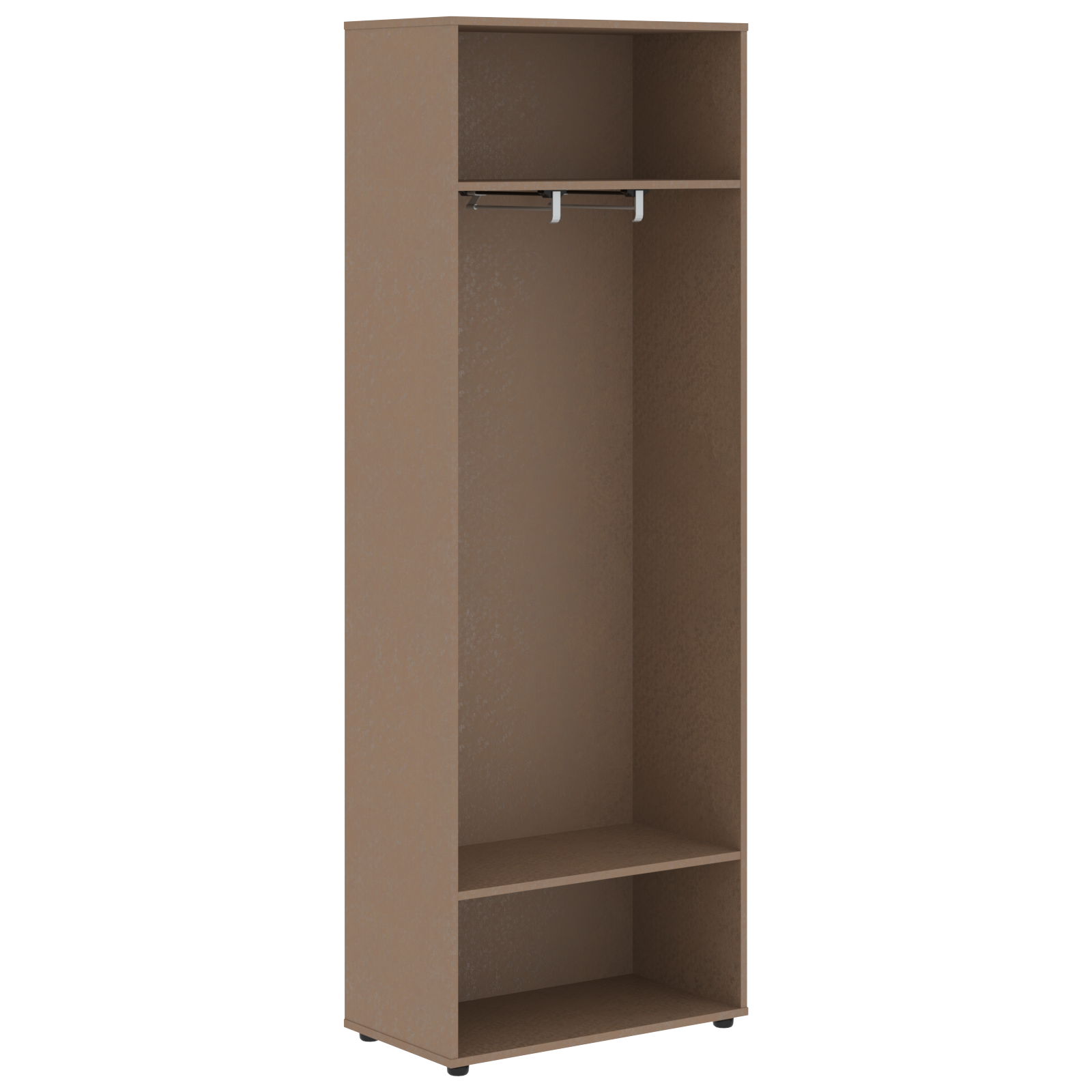 Каркас шкафа для одежды полностью из ЛДСП т.18мм с кромками ПВХ т.1 и 0,45мм, задняя стенка из ЛДСП. Каркас комплектуется двумя полками и двумя выдвижными штангами и регулируемыми опорами H=27мм.