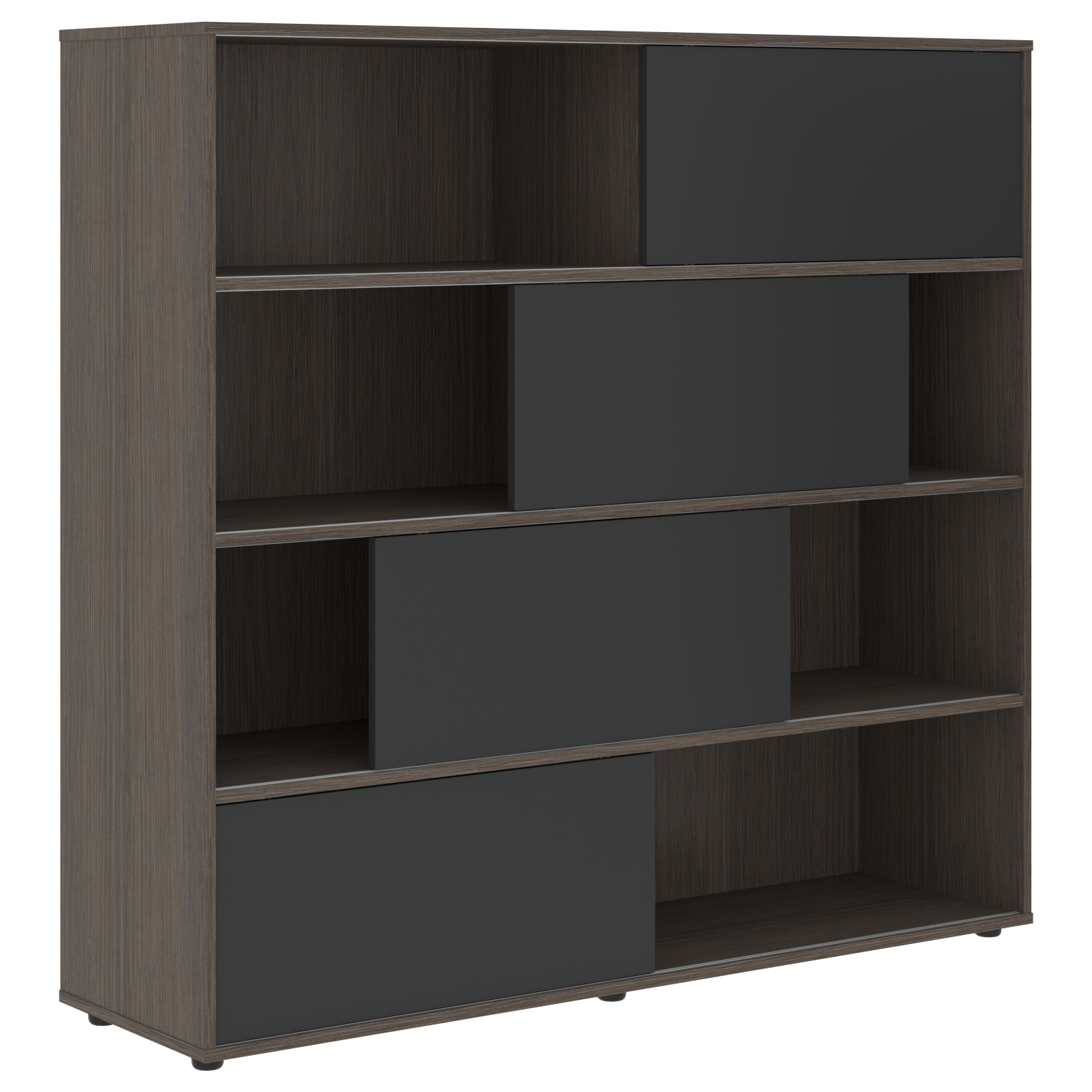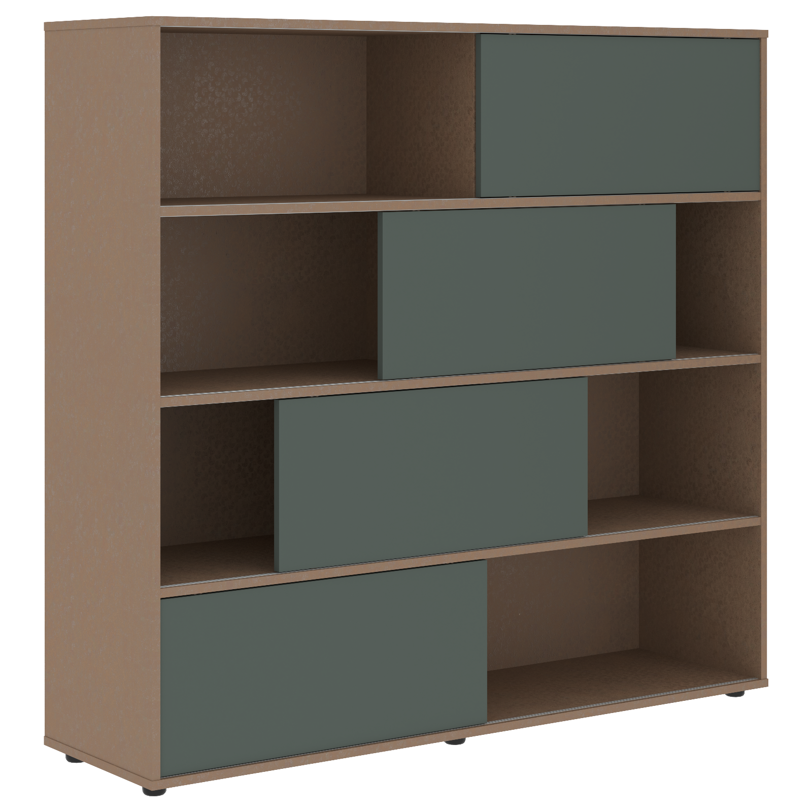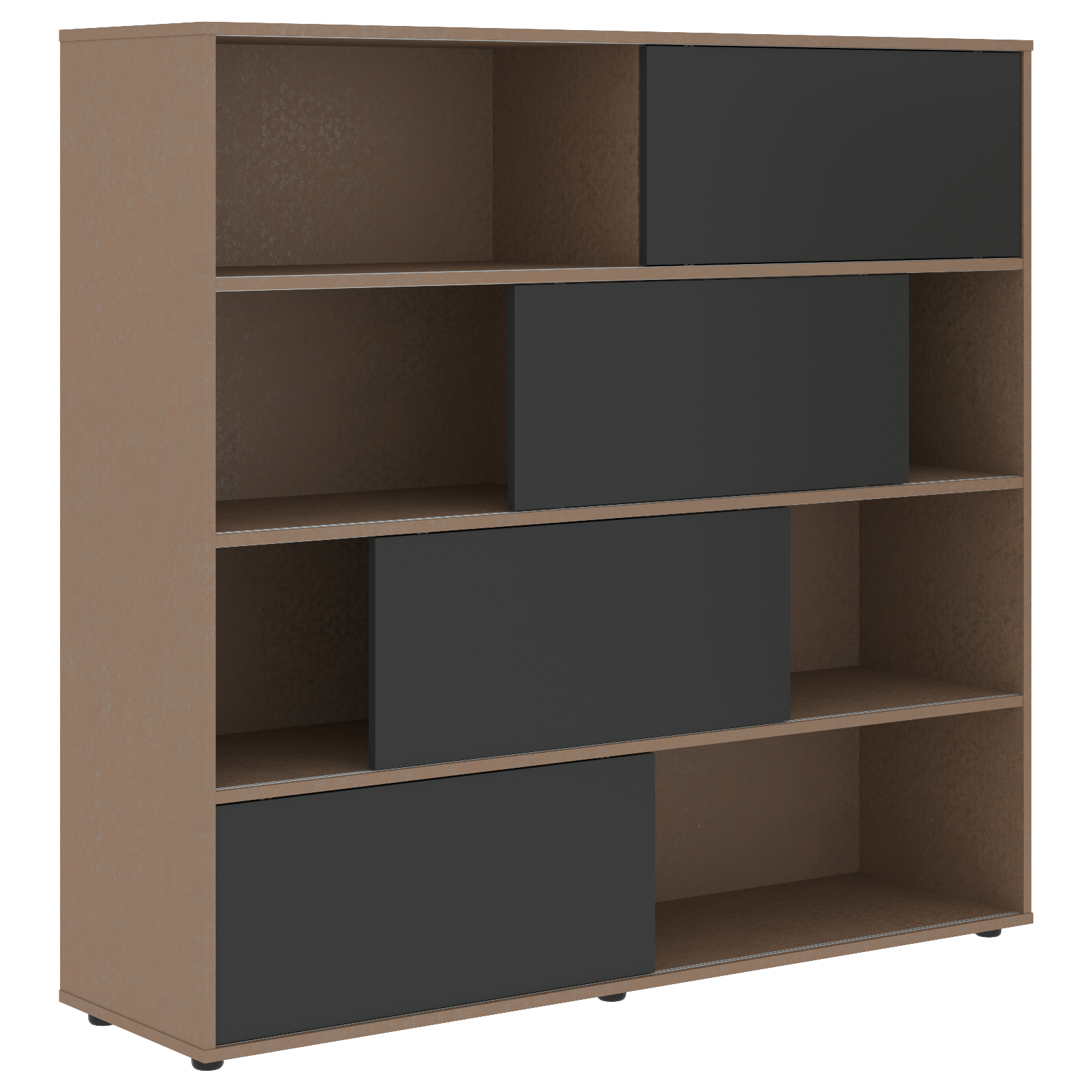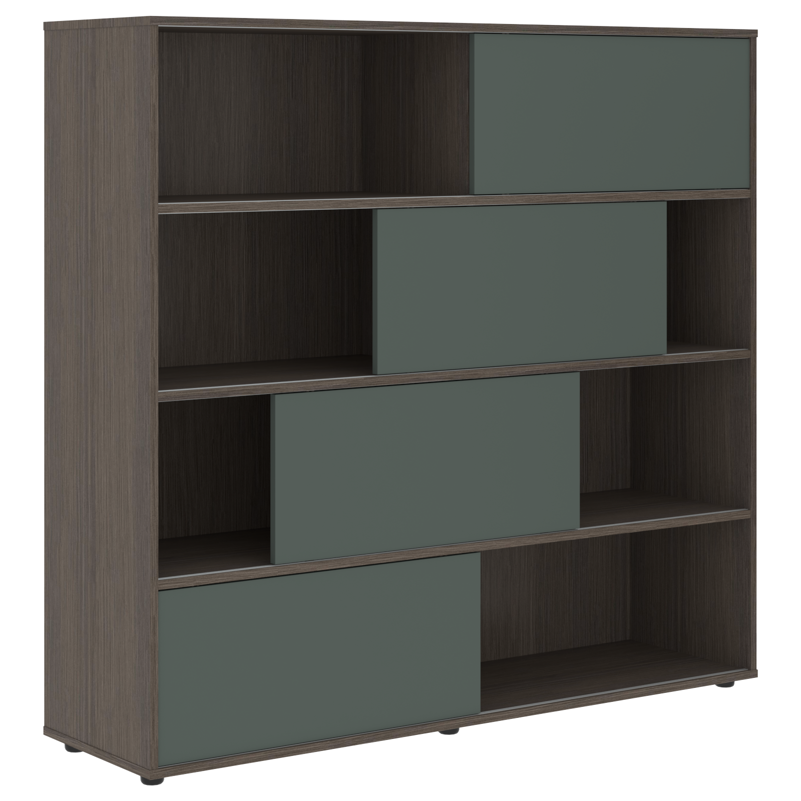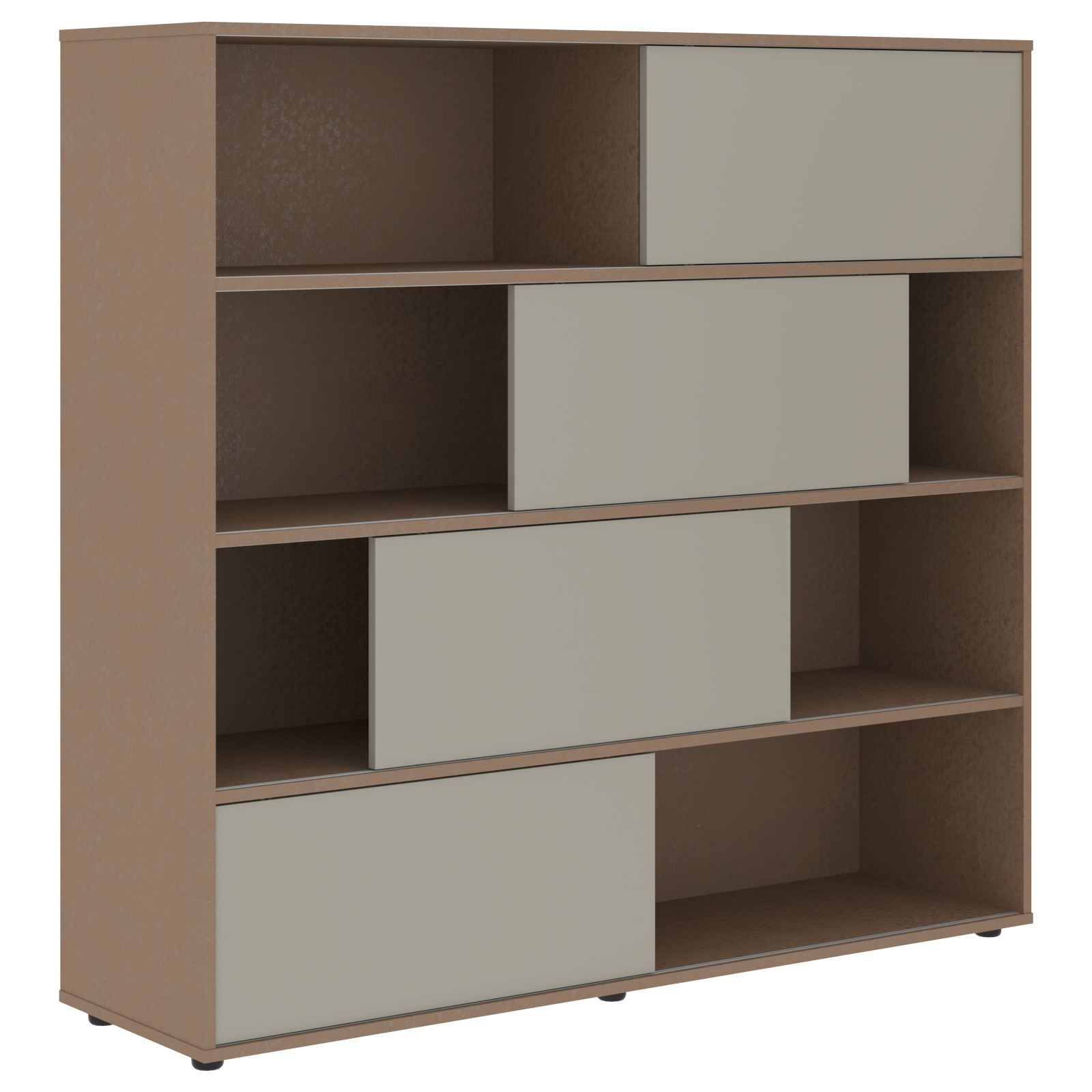 Каркас стеллажа и задняя стенка из ЛДСП т.18мм с кромками ПВХ т.1 и 0,45мм. На горизонтальных полках установлены пластиковые профили для слайд-дверей. Слайд-двери из МДФ т.18мм с 2-х сторонним покрытием пленкой PET(ПЭТ). Стеллаж комплектуется регулируемыми опорами H=27мм.