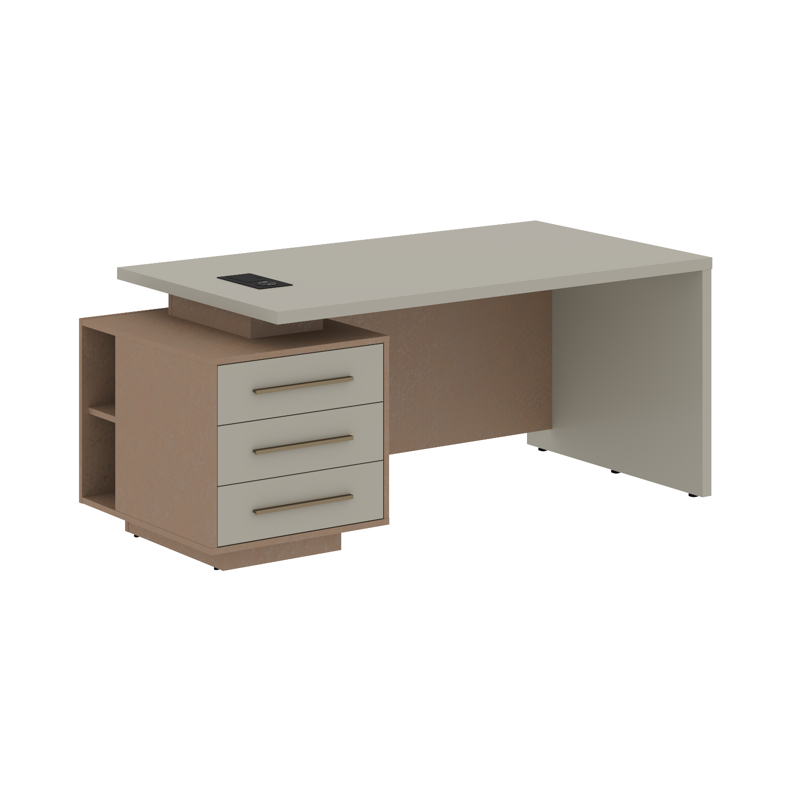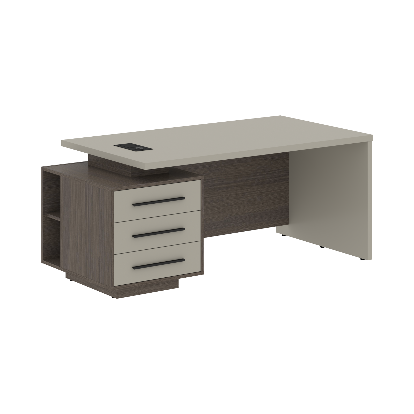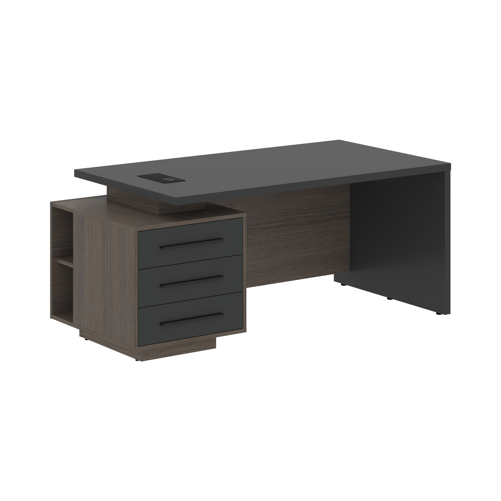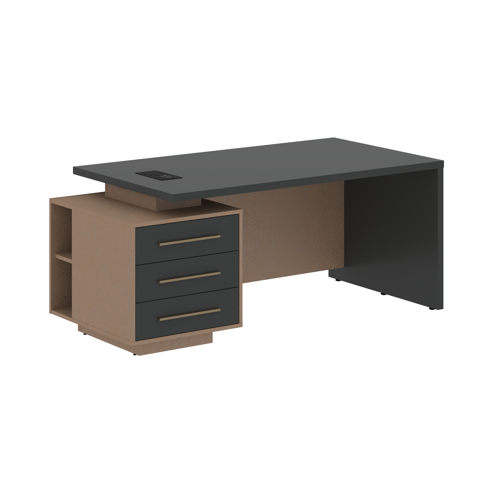 Столешница, опора выполнены из МДФ т.36мм с покрытием пленкой PET(ПЭТ), с кромками ПВХ т.2мм. Опорная тумба габаритом 603х749х546, каркас из ЛДСП т.18мм, видимые кромки ПВХ т.1мм, фасады ящиков вкладные из МДФ т.18мм в пленке PET(ПЭТ), комплектуются ручкой с межцентровым расстоянием 320мм. Ящики-фолдинги разборные 400х560х400мм, направляющие - шариковые с доводчиком. Фронтальная панель стола и каркаса тумбы общая, h=548мм. Для увеличения жесткости стола под столешницей установлена металлическая траверса. В столешнице встраиваемый розеточный блок AE-PB1SAVAP-20, цвет - черный, 2 порта USB A+C, индукционная зарядка 5W с проводом 1,5 метра.