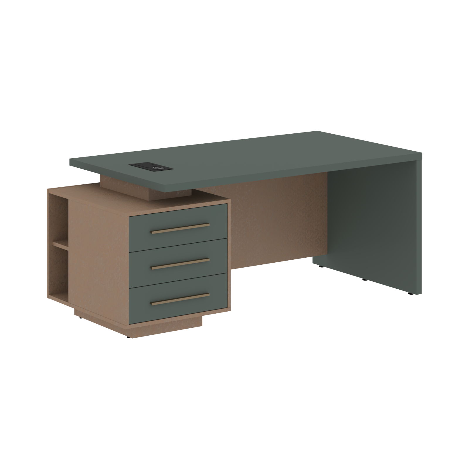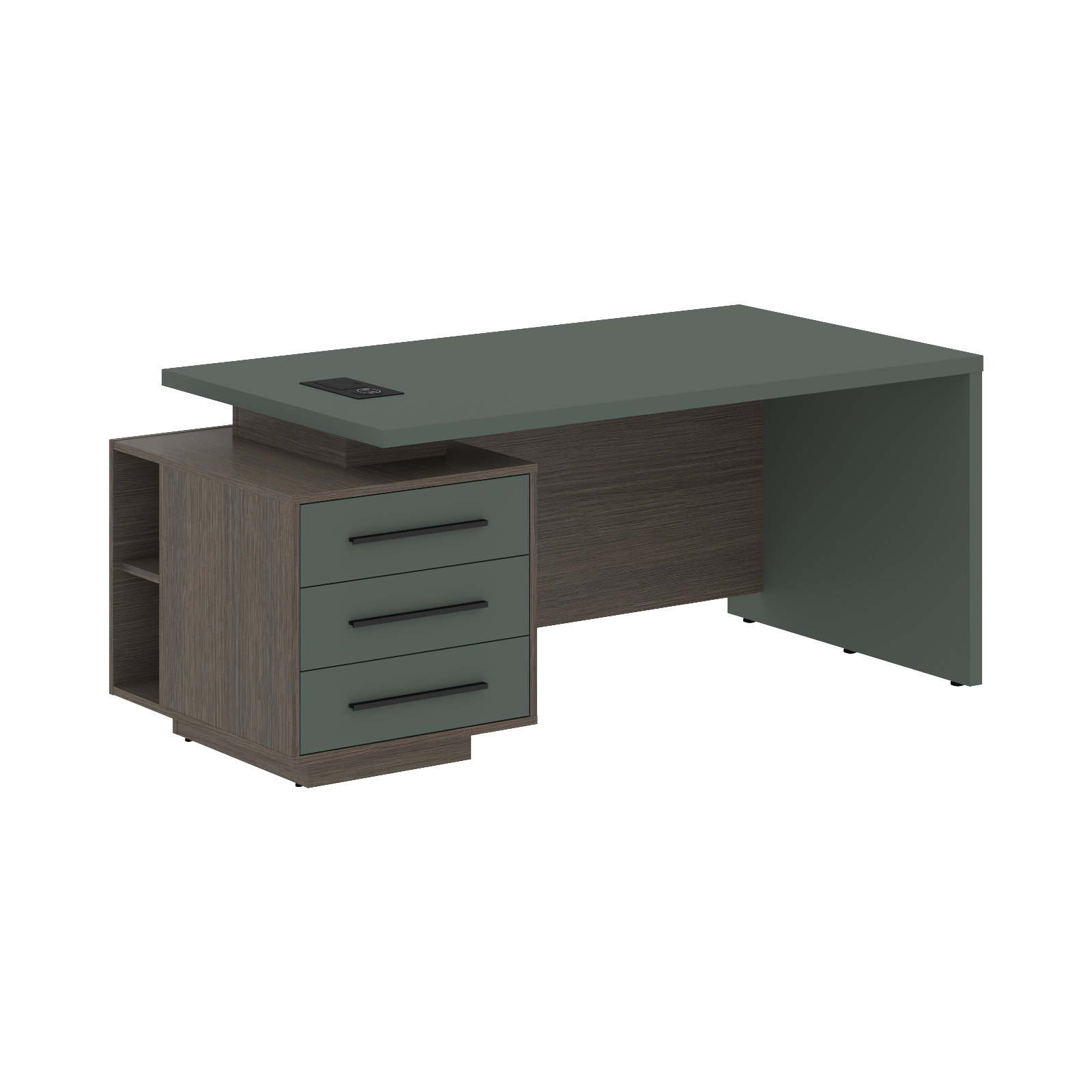 Столешница, опора выполнены из МДФ т.36мм с покрытием пленкой PET(ПЭТ), с кромками ПВХ т.2мм. Опорная тумба габаритом 603х749х546, каркас из ЛДСП т.18мм, видимые кромки ПВХ т.1мм, фасады ящиков вкладные из МДФ т.18мм в пленке PET(ПЭТ), комплектуются ручкой с межцентровым расстоянием 320мм. Ящики-фолдинги разборные 400х560х400мм, направляющие - шариковые с доводчиком. Фронтальная панель стола и каркаса тумбы общая, h=548мм. Для увеличения жесткости стола под столешницей установлена металлическая траверса. В столешнице встраиваемый розеточный блок AE-PB1SAVAP-20, цвет - черный, 2 порта USB A+C, индукционная зарядка 5W с проводом 1,5 метра.