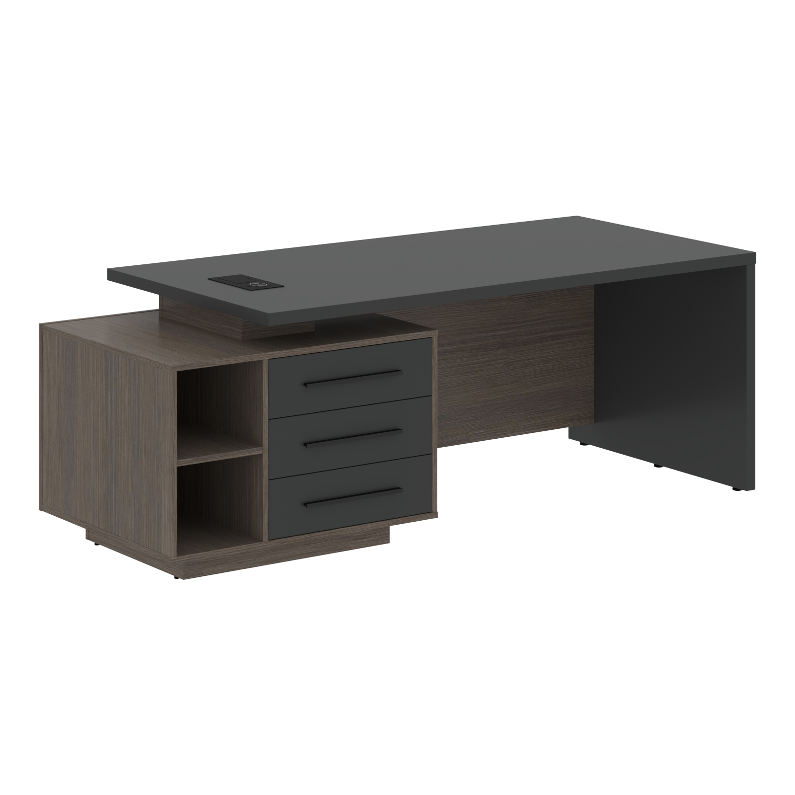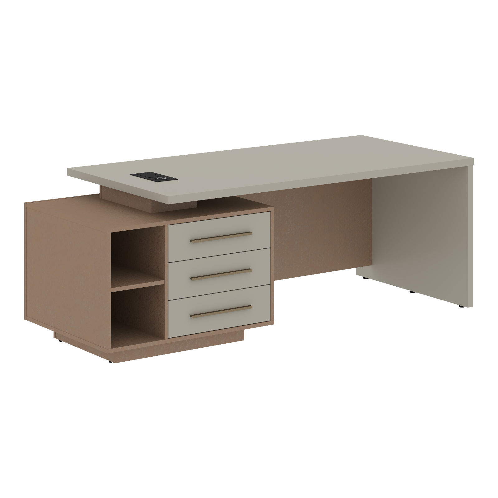 Столешница, опора выполнены из МДФ т.36мм с покрытием пленкой PET(ПЭТ), с кромками ПВХ т.2мм. Опорная тумба габаритом 903х749х546, каркас из ЛДСП т.18мм, видимые кромки ПВХ т.1мм, фасады ящиков вкладные из МДФ т.18мм в пленке PET(ПЭТ), комплектуются ручкой с межцентровым расстоянием 320мм. Ящики-фолдинги разборные 400х560х400мм, направляющие - шариковые с доводчиком. Фронтальная панель стола и каркаса тумбы общая, h=548мм. Для увеличения жесткости стола под столешницей установлена металлическая траверса. В столешнице встраиваемый розеточный блок AE-PB1SAVAP-20, цвет - черный, 2 порта USB A+C, индукционная зарядка 5W с проводом 1,5 метра.