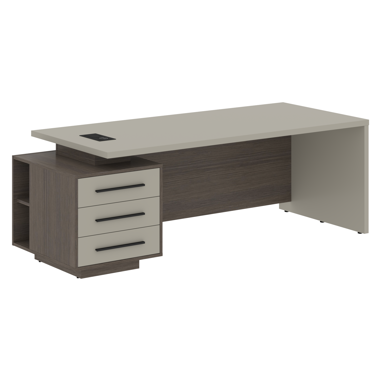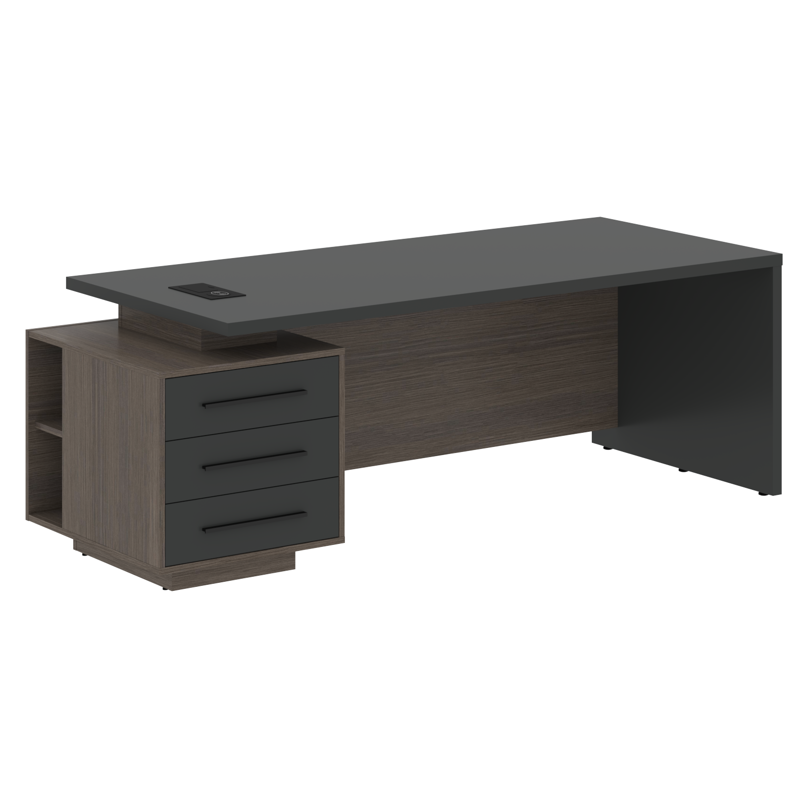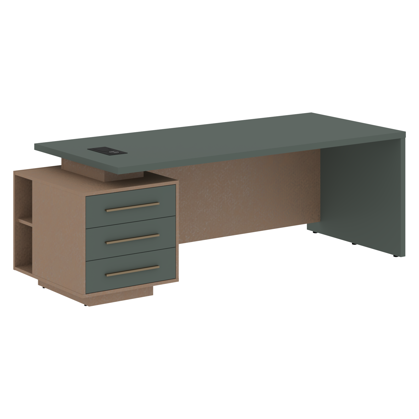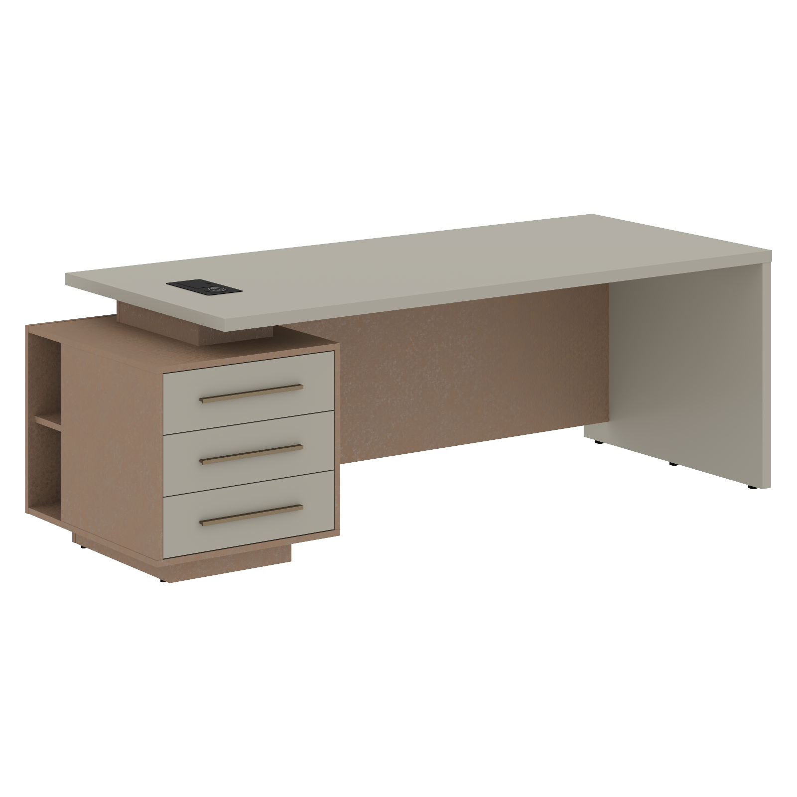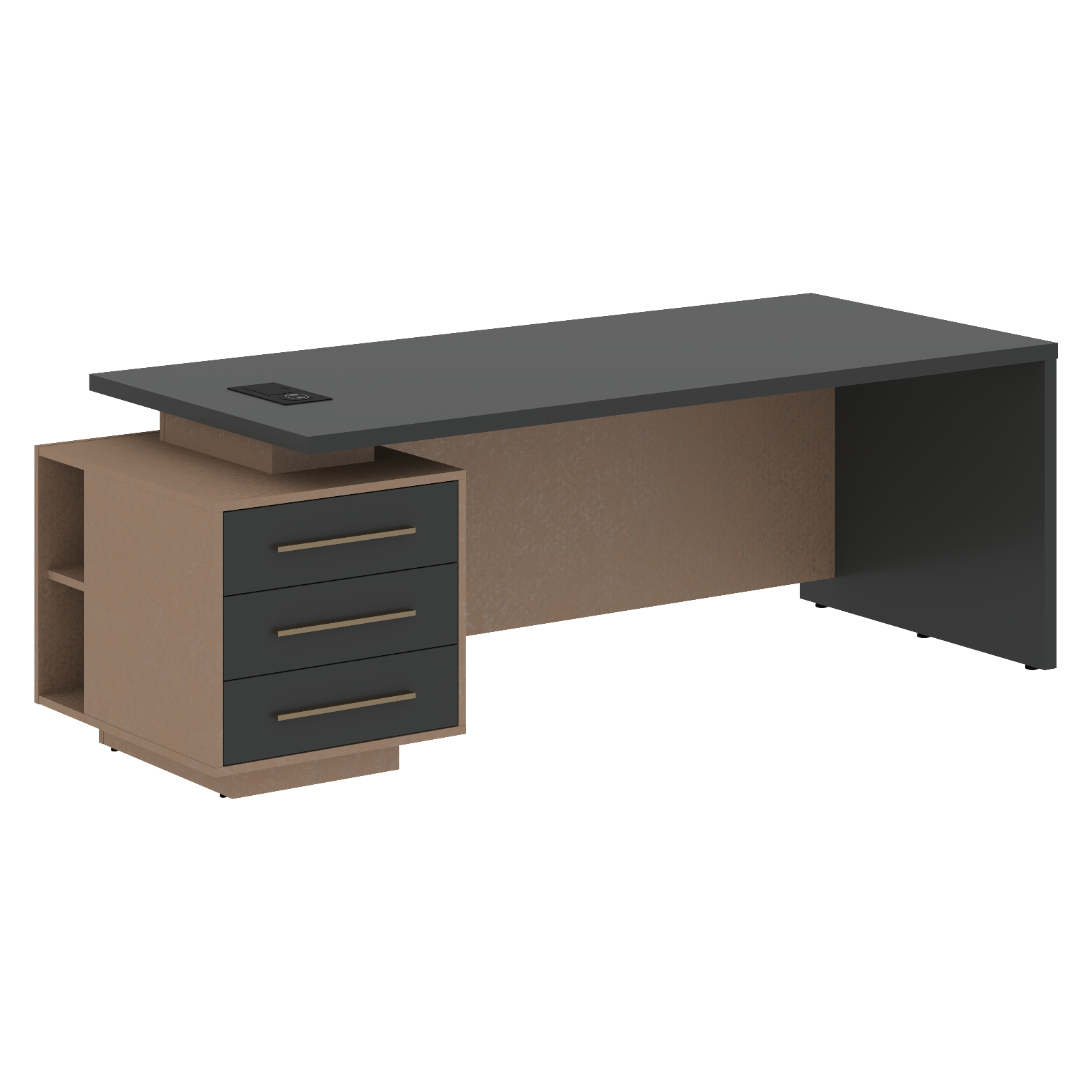 Столешница, опора выполнены из МДФ т.36мм с покрытием пленкой PET(ПЭТ), с кромками ПВХ т.2мм. Опорная тумба габаритом 603х749х546, каркас из ЛДСП т.18мм, видимые кромки ПВХ т.1мм, фасады ящиков вкладные из МДФ т.18мм в пленке PET(ПЭТ), комплектуются ручкой с межцентровым расстоянием 320мм. Ящики-фолдинги разборные 400х560х400мм, направляющие - шариковые с доводчиком. Фронтальная панель стола и каркаса тумбы общая, h=548мм. Для увеличения жесткости стола под столешницей установлена металлическая траверса. В столешнице встраиваемый розеточный блок AE-PB1SAVAP-20, цвет - черный, 2 порта USB A+C, индукционная зарядка 5W с проводом 1,5 метра.