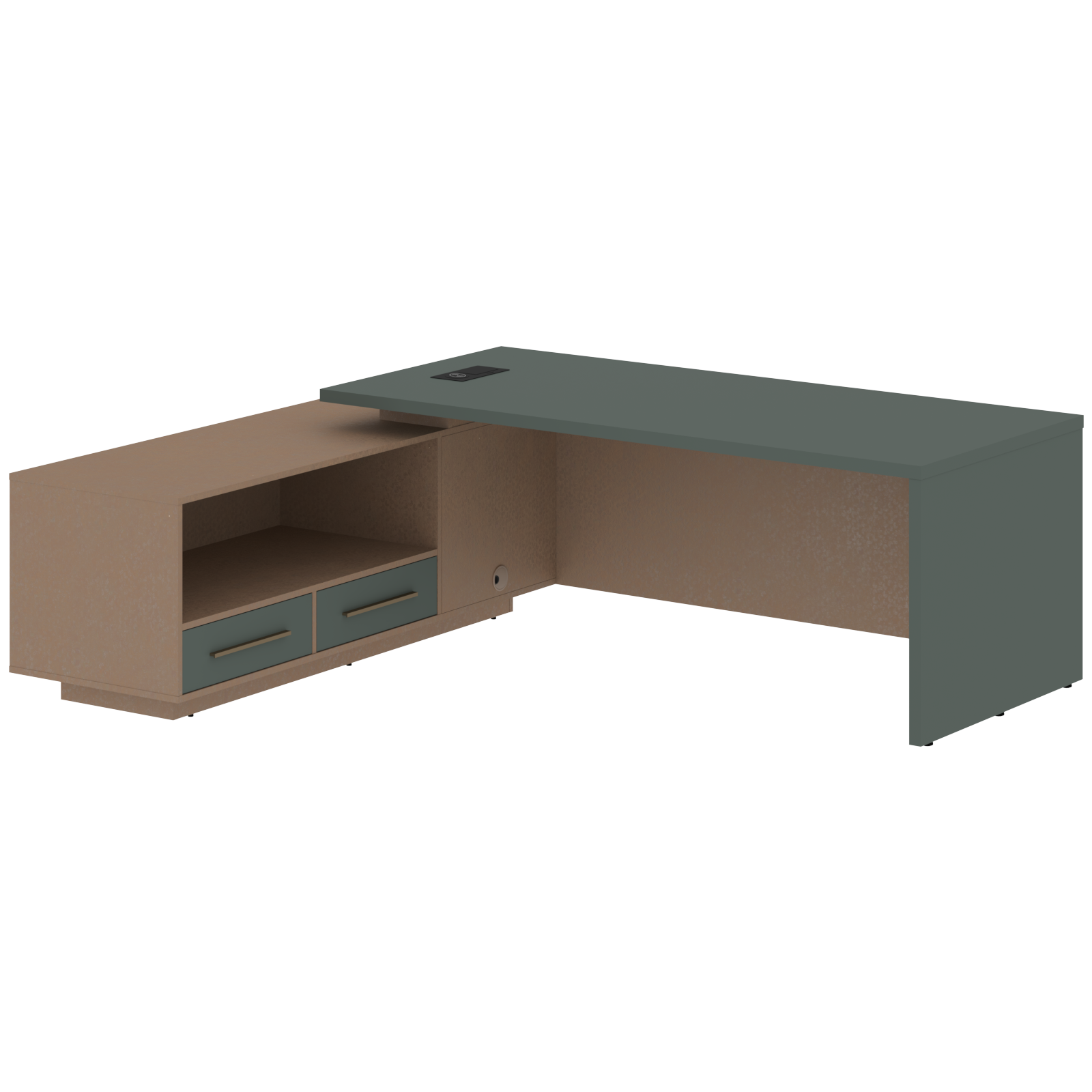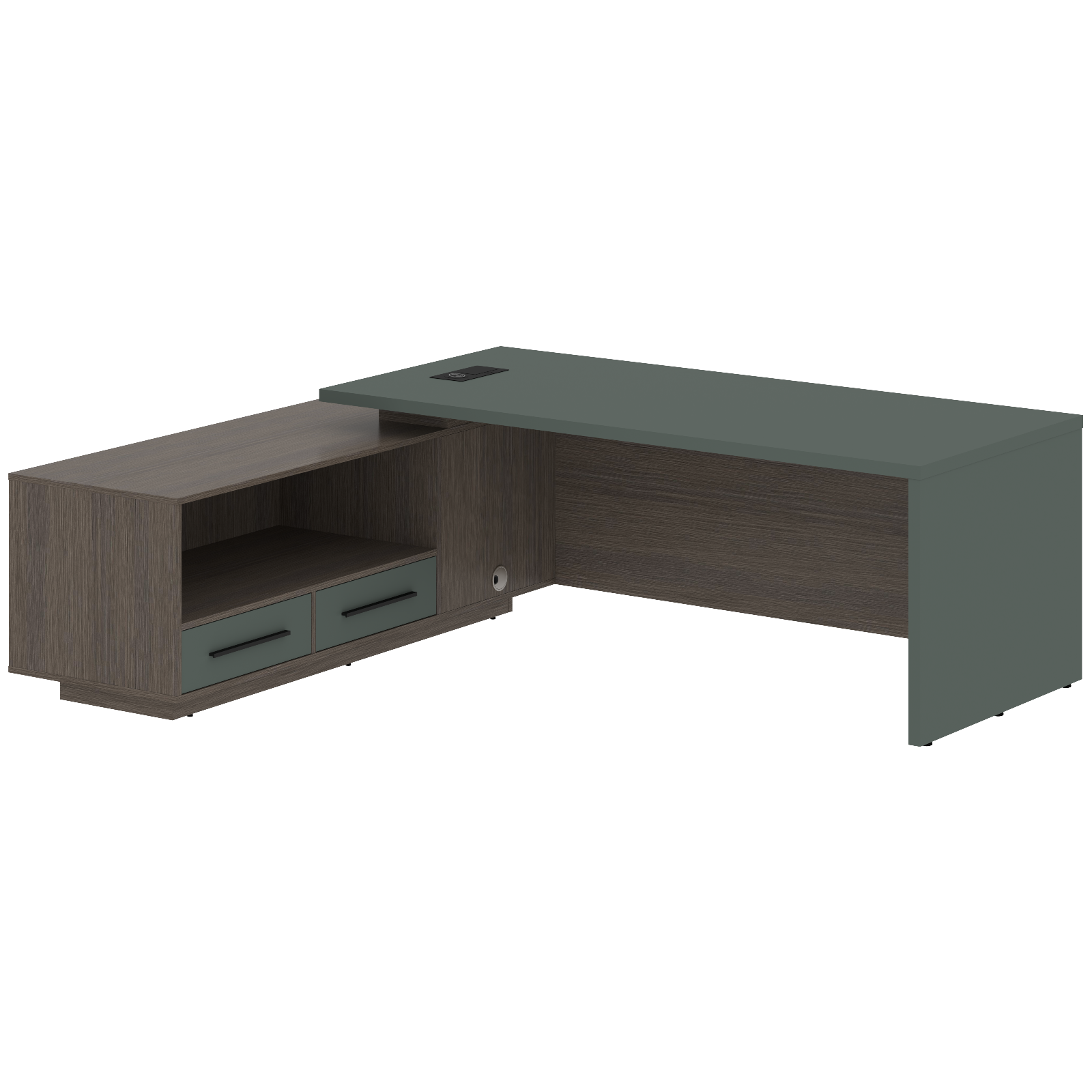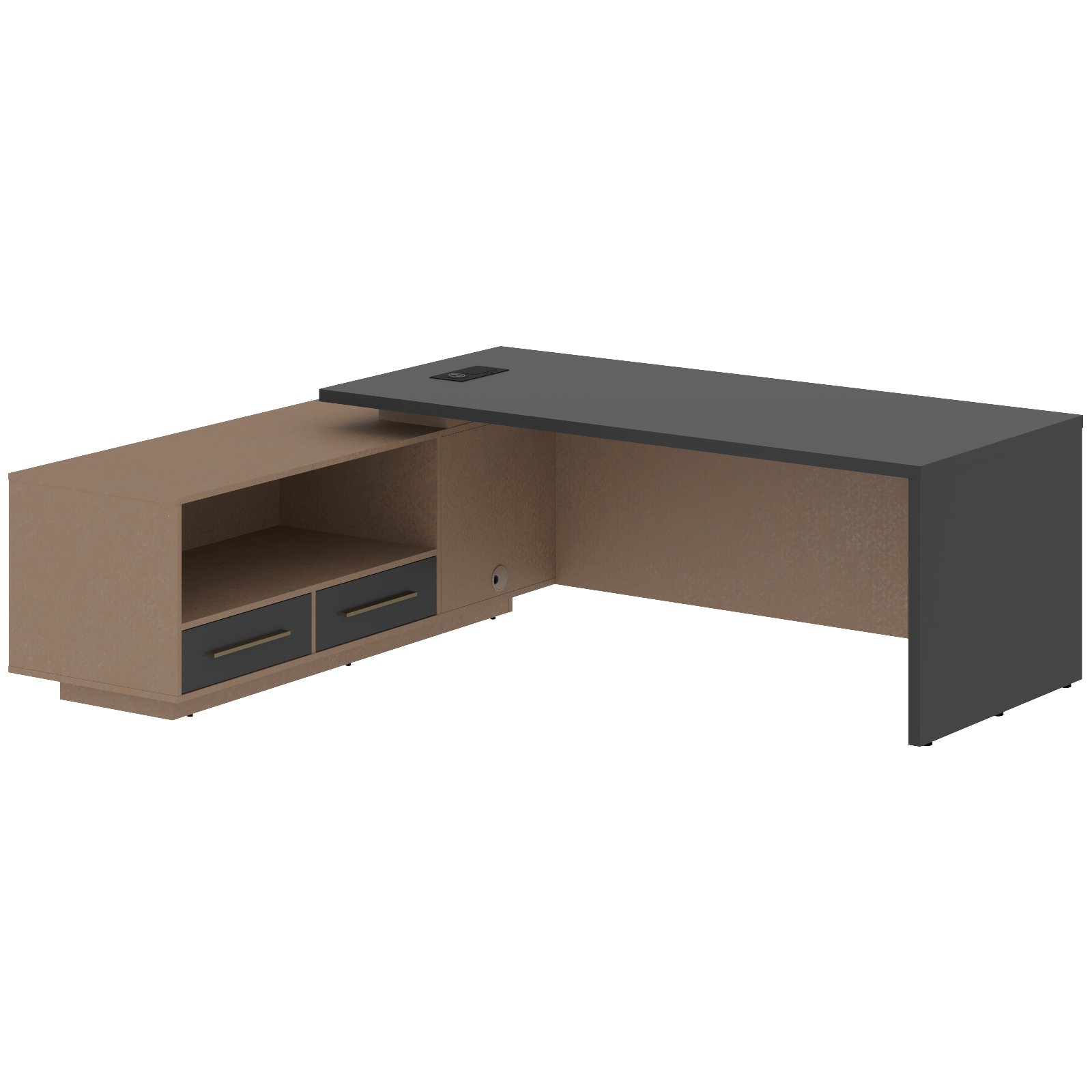 Столешница, опора выполнены из МДФ т.36мм с покрытием пленкой PET(ПЭТ), с кромками ПВХ т.2мм. Опорная тумба габаритом 1779х600х546, каркас из ЛДСП т.18мм, видимые кромки ПВХ т.1мм, фасады ящиков вкладные из МДФ т.18мм в пленке PET(ПЭТ), комплектуются ручкой с межцентровым расстоянием 320мм. Ящики-фолдинги разборные 400х560х400мм, направляющие - шариковые с доводчиком. Фронтальная панель стола и каркаса тумбы общая, h=548мм. Для увеличения жесткости стола под столешницей установлена металлическая траверса. В столешнице встраиваемый розеточный блок AE-PB1SAVAP-20, цвет - черный, 2 порта USB A+C, индукционная зарядка 5W с проводом 1,5 метра.