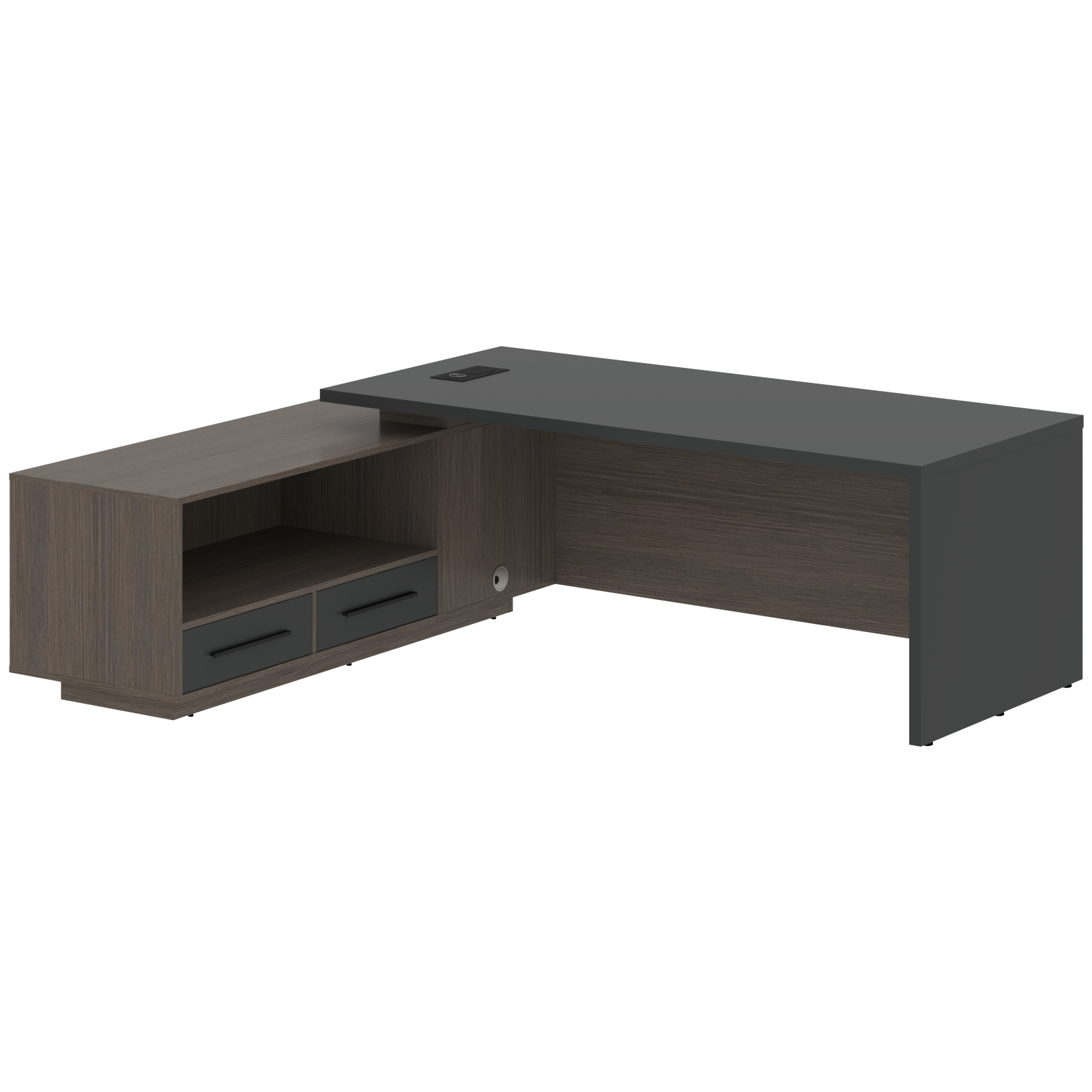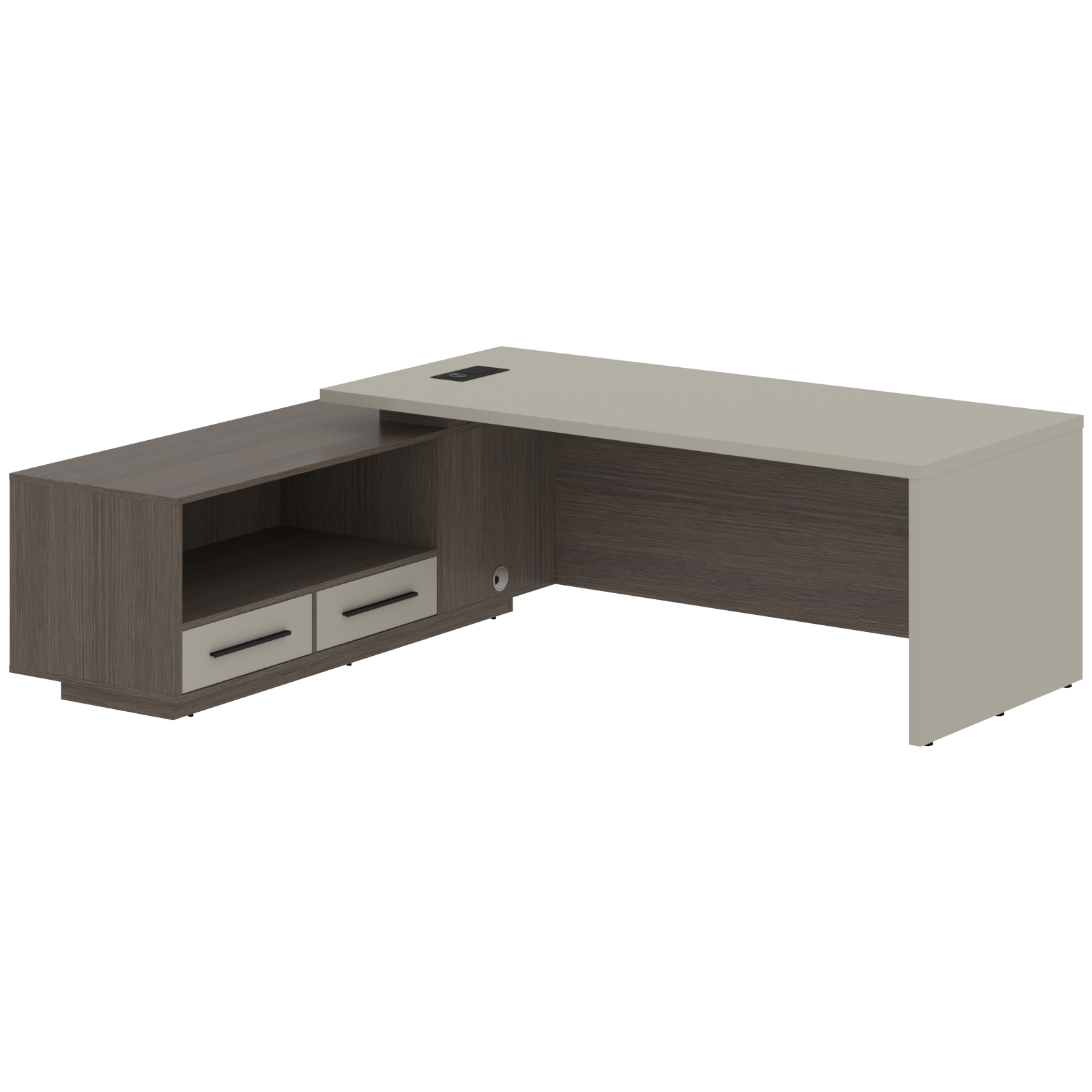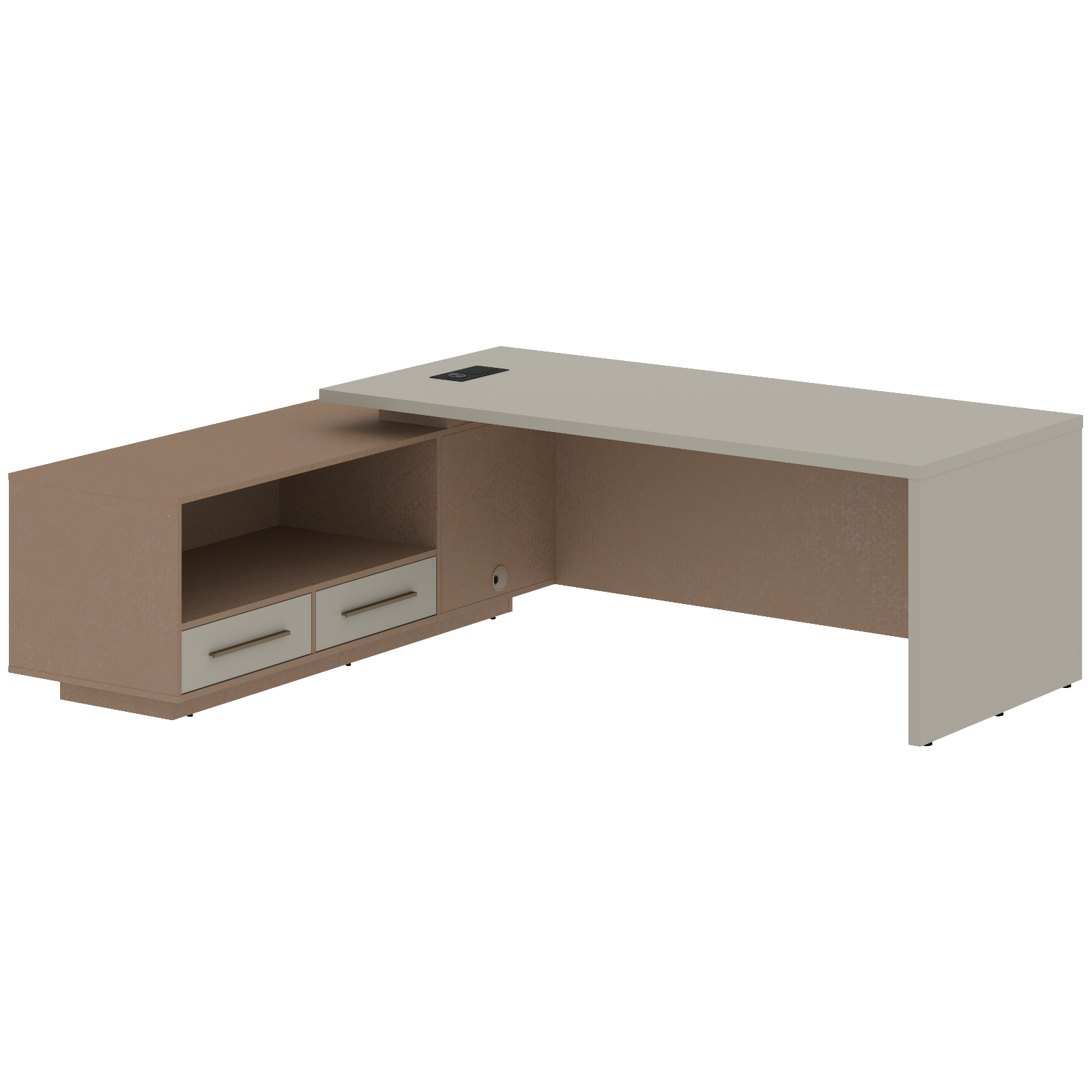 Столешница, опора выполнены из МДФ т.36мм с покрытием пленкой PET(ПЭТ), с кромками ПВХ т.2мм. Опорная тумба габаритом 1779х600х546, каркас из ЛДСП т.18мм, видимые кромки ПВХ т.1мм, фасады ящиков вкладные из МДФ т.18мм в пленке PET(ПЭТ), комплектуются ручкой с межцентровым расстоянием 320мм. Ящики-фолдинги разборные 400х560х400мм, направляющие - шариковые с доводчиком. Фронтальная панель стола и каркаса тумбы общая, h=548мм. Для увеличения жесткости стола под столешницей установлена металлическая траверса. В столешнице встраиваемый розеточный блок AE-PB1SAVAP-20, цвет - черный, 2 порта USB A+C, индукционная зарядка 5W с проводом 1,5 метра.