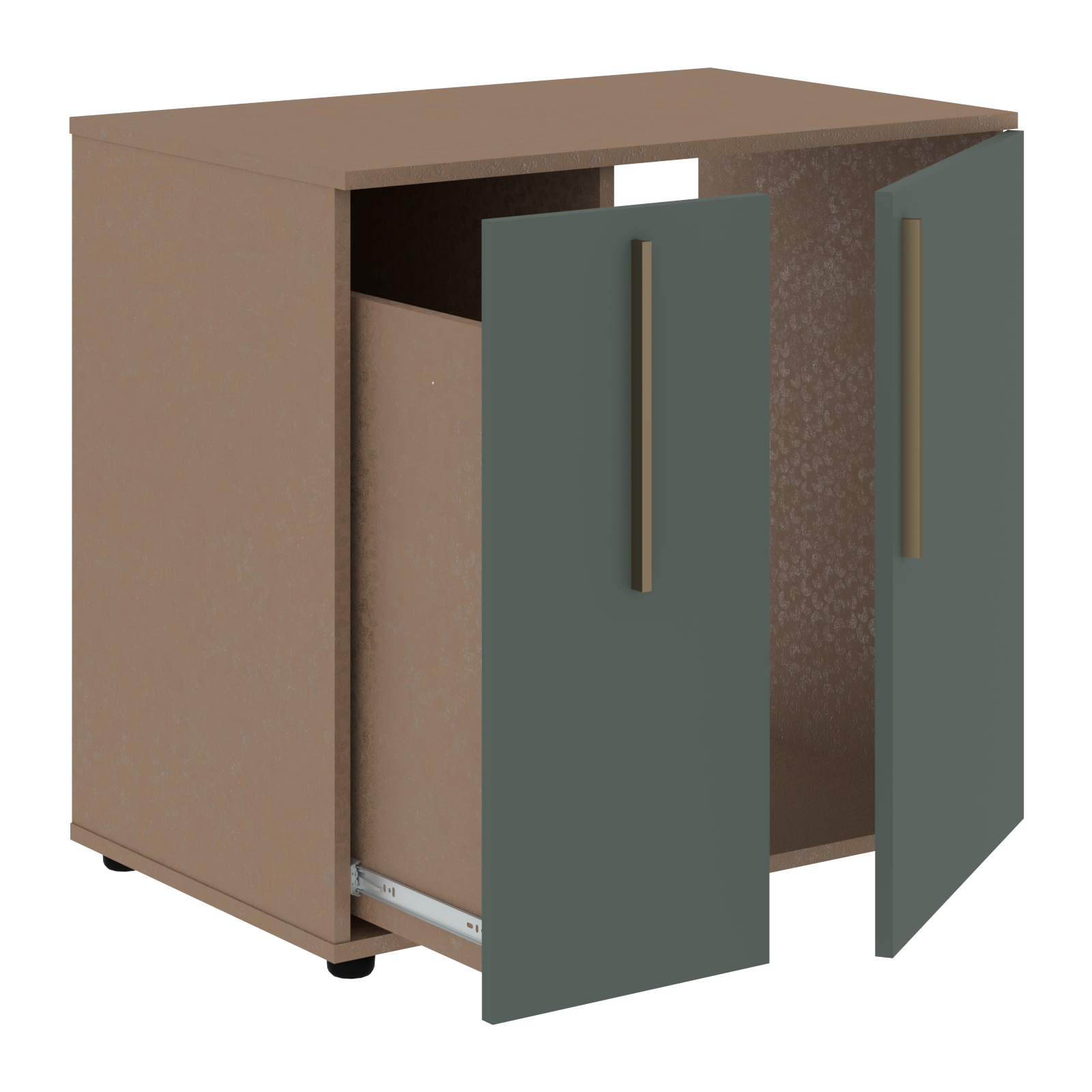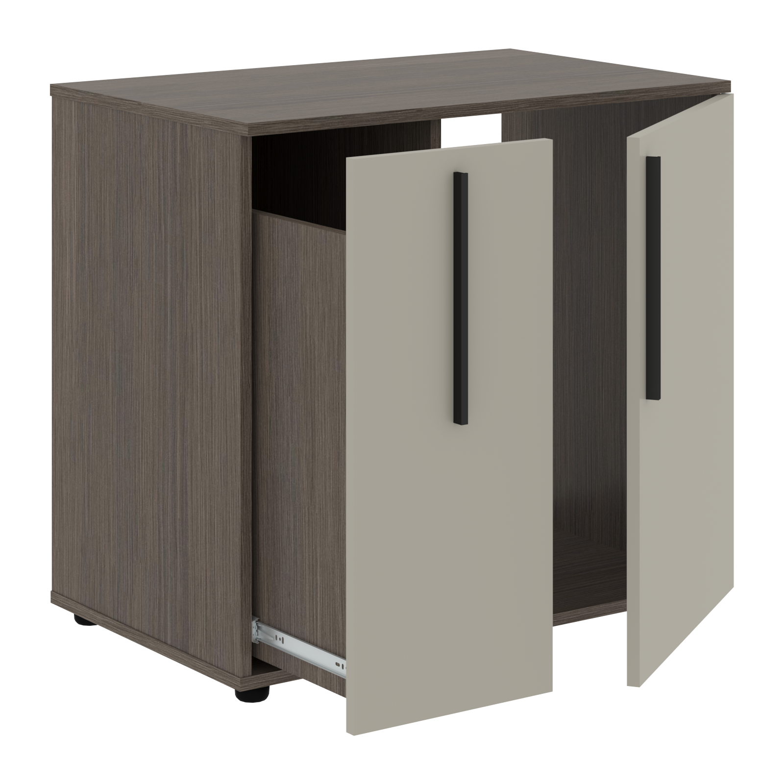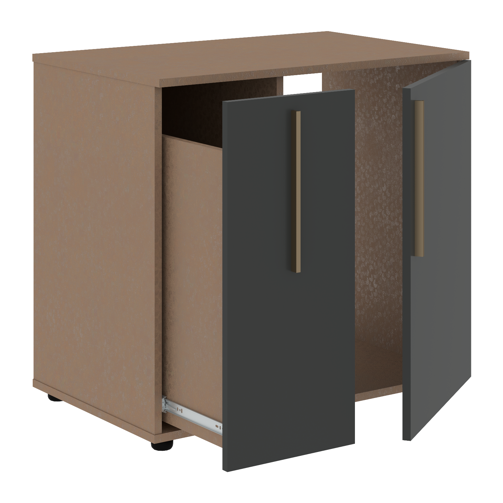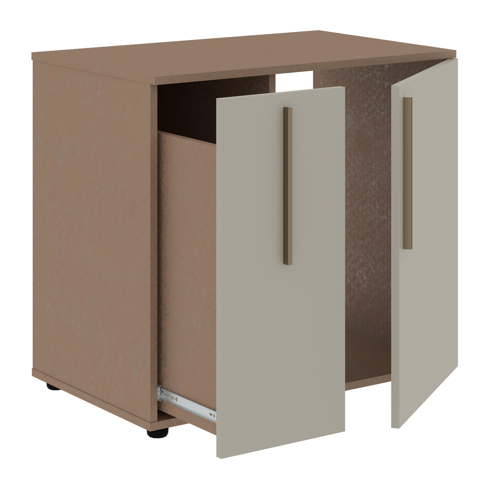 Тумба с 2-мя секциями: секция под холодильник габаритом 502х526х737 и выдвижная секция верхняя для бокалов и нижняя для охлажденных напитков габаритом 238х479х328 и 238х479х349мм. Каркас тумбы и топ из ЛДСП т.18мм, фасады из МДФ т.18мм с 2- сторонним покрытием пленкой РЕТ(ПЭТ) с кромкой ПВХ т.2мм по периметру. Комплектуется ручками металлическими VRS 8170 320/330.