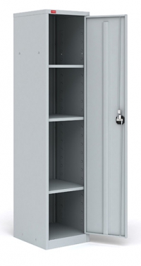 Шкаф разборный односекционный металлический. Имеет три регулируемые по высоте полки, дверь шкафа оборудована замком повышенной секретности и ригельной системой запирания.