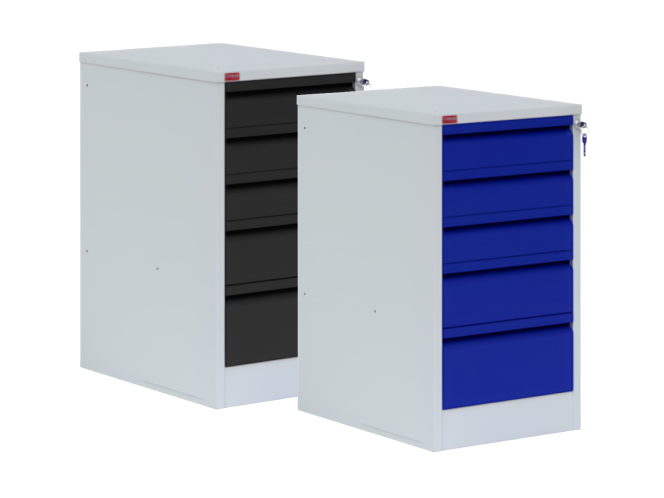 Тумба для металлического верстака может использоваться как с верстаком, так и как отдельный элемент металлического мебели. Состоит из 5-ти выдвижных ящиков, запирающихся на общий замок. Нагрузка на ящик до 30 кг.