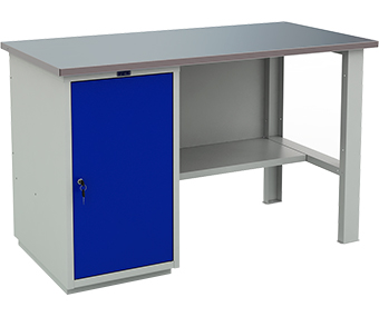 Верстак окрашен порошковой краской, цвет покрытия корпуса серый шагрень (RAL 7038), лицевая панель дверцы тумбы – синий шагрень (RAL 5002)