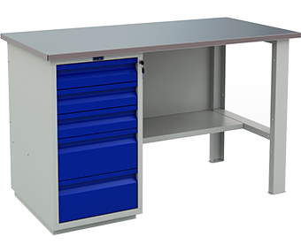Верстак состоит из тумбы WD5 и опоры F1 .Тумба укомплектована 5-ю выдвижными ящиками. Ящики открываются на телескопических направляющих. Нагрузка на ящик 30 кг.Все ящики закрываются на центральный ключевой замок.