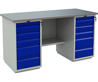 Верстак состоит из 2 тумб WD5. Тумба укомплектована 5-ю выдвижными ящиками. Ящики открываются на телескопических направляющих. Нагрузка на ящик 30 кг. Все ящики закрываются на центральный ключевой замок