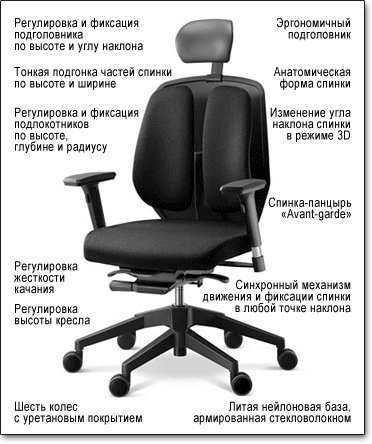 Кресло оснащено множеством различных настроек: рост, вес, индивидуальные особенности пользователя – все это дает возможность повысить уровень комфортабельности при долгой сидячей работе.