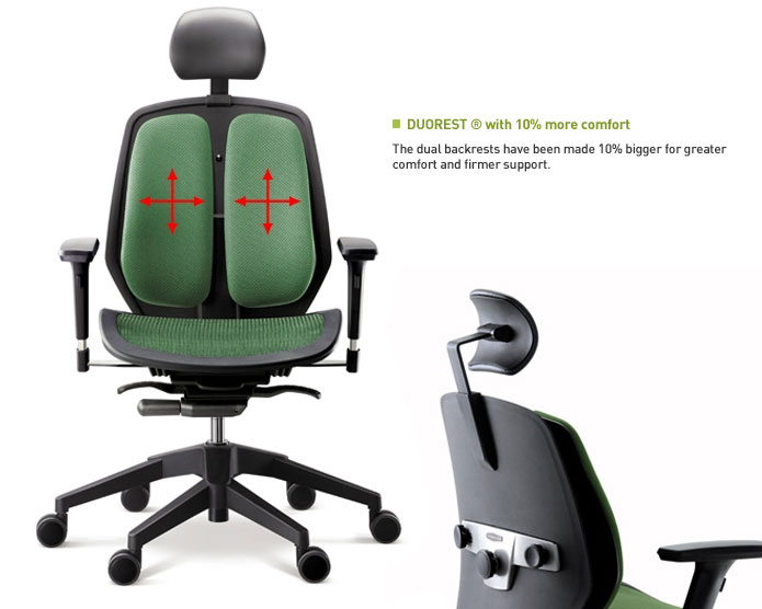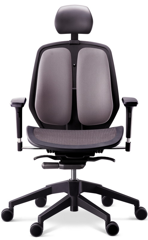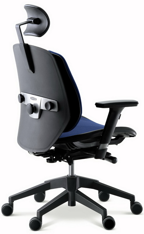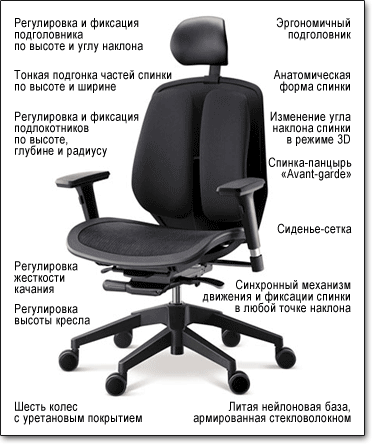 Компьютерное кресло с системой двойной ортопедической спинки "Backrest". Спинка крепится к декоративному панцирю "Avant-garde". Сиденье из термопластичного полиэстера (DuPont thermoplastic polyester elastomer).