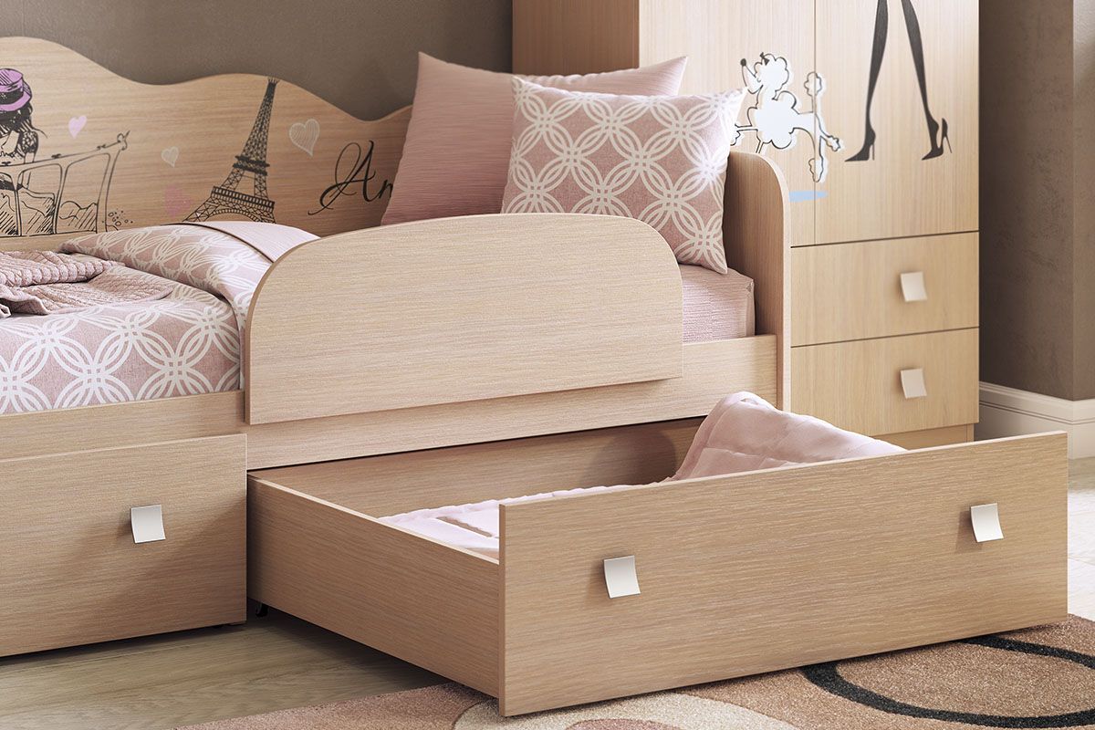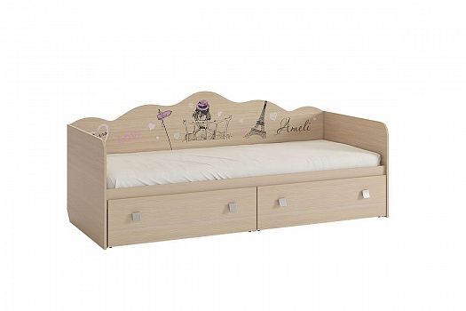 Романтичная софа «Амели» – обрадует каждую девочку. Удобное спальное место и 2-а больших выдвижных ящика для хранения постельного белья и игрушек. Элегантный принтерный рисунок на спинке софы выдержан в общем стилистическом решении. Рисунок устойчив к истиранию и ультрафиолету. Детская «Амели»- все, что нужно истинной леди! Рекомендуем комплектовать: с остальными модулями детской