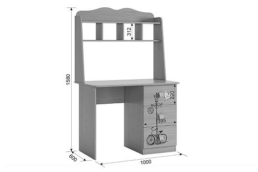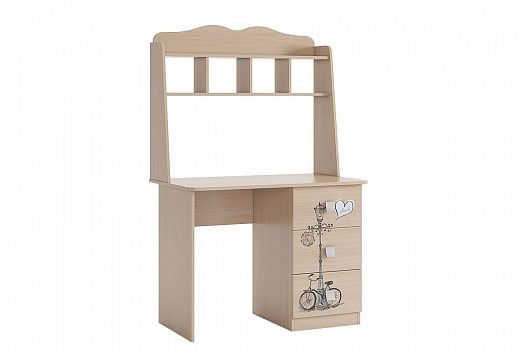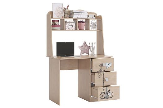 Романтичный стол «Амели» – обрадует каждую девочку. Компактный стол прекрасно впишется даже в маленькое пространство детской комнаты. Удобная столешница подойдет как для письма, так и для занятий на компьютере или ноутбуке. Открытые полки надстройки стола хорошо подходят для хранения учебников и школьных принадлежностей. В 3-х выдвижных ящиков поместится все, что необходимо для учебы и творчества. Элегантный принтерный рисунок на фасадах выдержан в общем стилистическом решении. Рисунок устойчив к истиранию и ультрафиолету. Детская «Амели»- все, что нужно истинной леди!