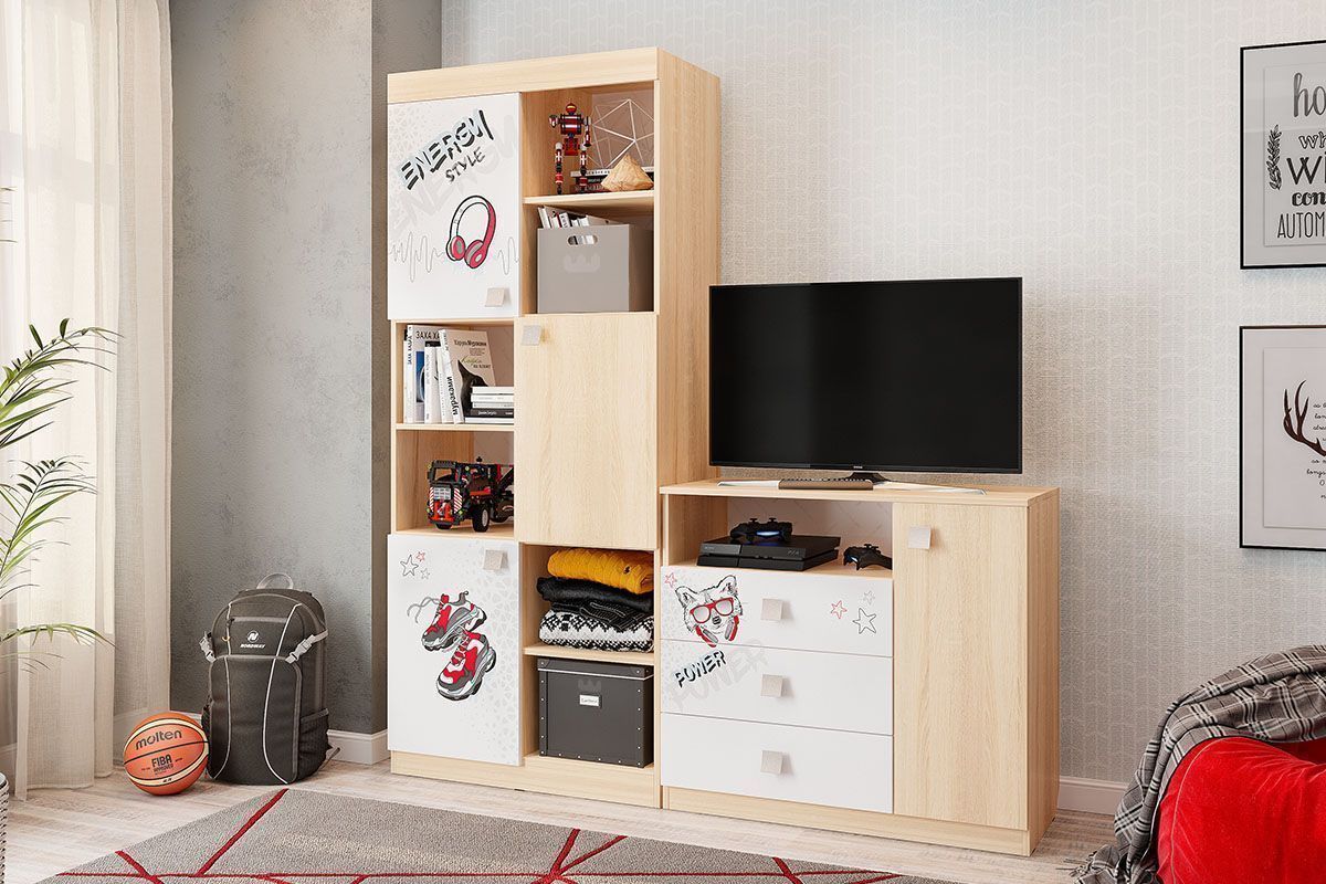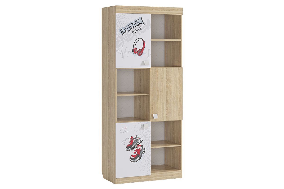6-ти открытых ниш и 3-х закрытых. Стеллаж с открытыми и закрытыми полками идеально подойдет для книг, игрушек и мелочей. Эффектный принтерный рисунок на фасадах выдержан в общем стилистическом решении. Рисунок устойчив к истиранию и ультрафиолету. Детская «Энерджи»- все, что нужно для современного подростка!