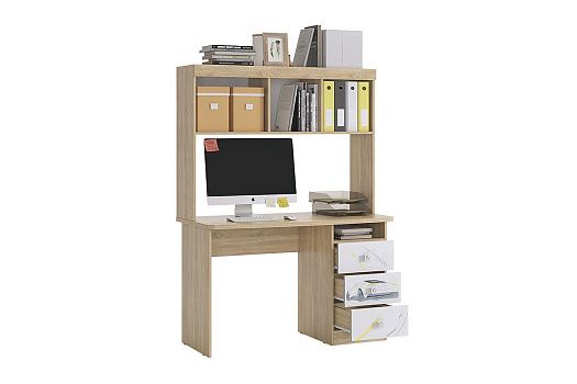 Состоит из: столешницы, 3-х выдвижных ящиков и полки для книг с закрытой нишей и открытыми полками.