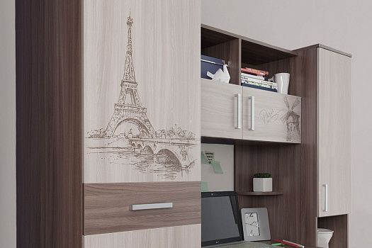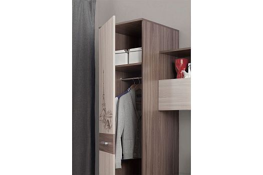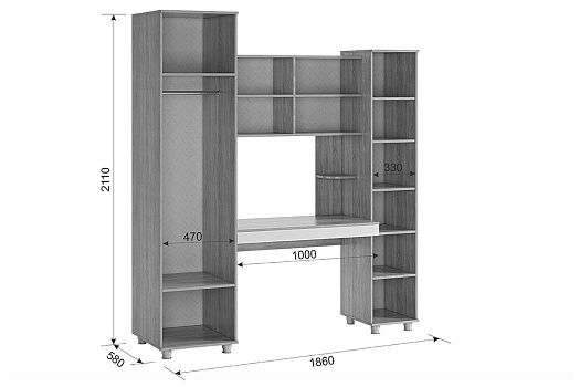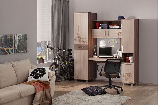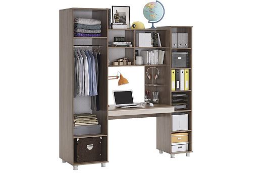 Комплекс «Миллениум» - это стол, стеллаж и шкаф для одежды в одном изделии! Всё, что нужно для ученика или студента. Есть место для полноценной работы за компьютером, полки и стеллаж для книг, а также вместительный шкаф со штангой для одежды. Только дополните комплекс диваном или кроватью – и комната готова!