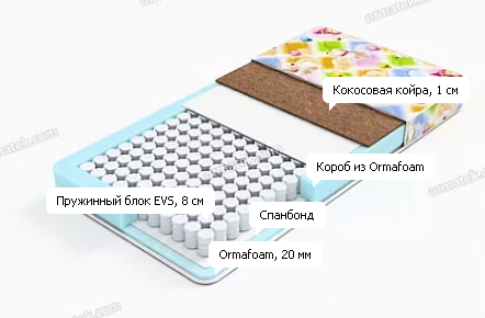 Матрас на блоке независимых пружин со сторонами разной жесткости. Одна сторона усилена кокосовой плитой и обеспечивает правильную поддержку позвоночника малыша 3-6 лет. Вторая сторона, смягченная слоем современного гипоаллергенного материала ormafoam, создает комфортные условия для ребенка 6-12 лет. Примечание: матрас со сторонами разной жесткости для детей от 3 до 12 лет.