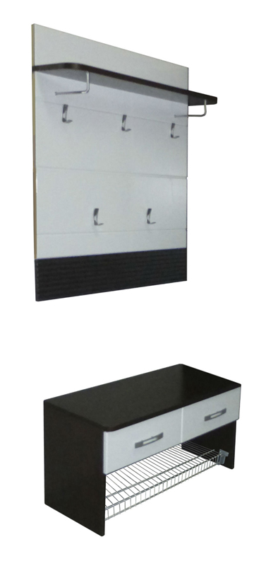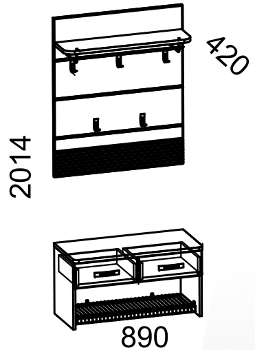 В состав модуля входит панель с крючками и тумба для обуви.